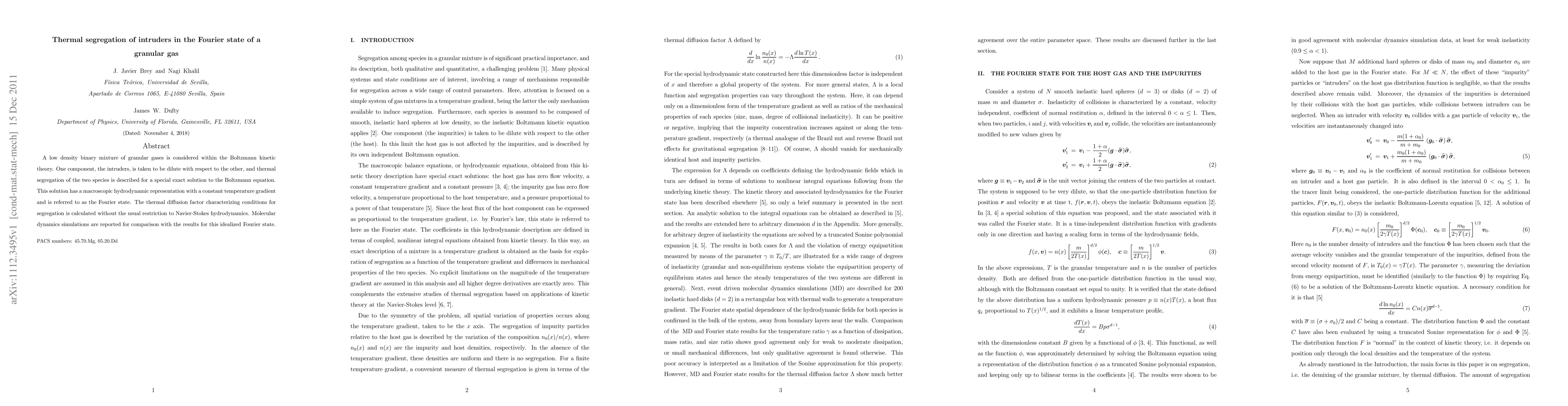 A low density binary mixture of granular gases is considered within the Boltzmann kinetic theory. One component, the intruders, is taken to be dilute with respect to the other, and thermal segregation of the two species is described for a special exact solution to the Boltzmann equation. This solution has a macroscopic hydrodynamic representation with a constant temperature gradient and is referred to as the Fourier state. The thermal diffusion factor characterizing conditions for segregation is calculated without the usual restriction to Navier-Stokes hydrodynamics. Molecular dynamics simulations are reported for comparison with the results for this idealized Fourier state.