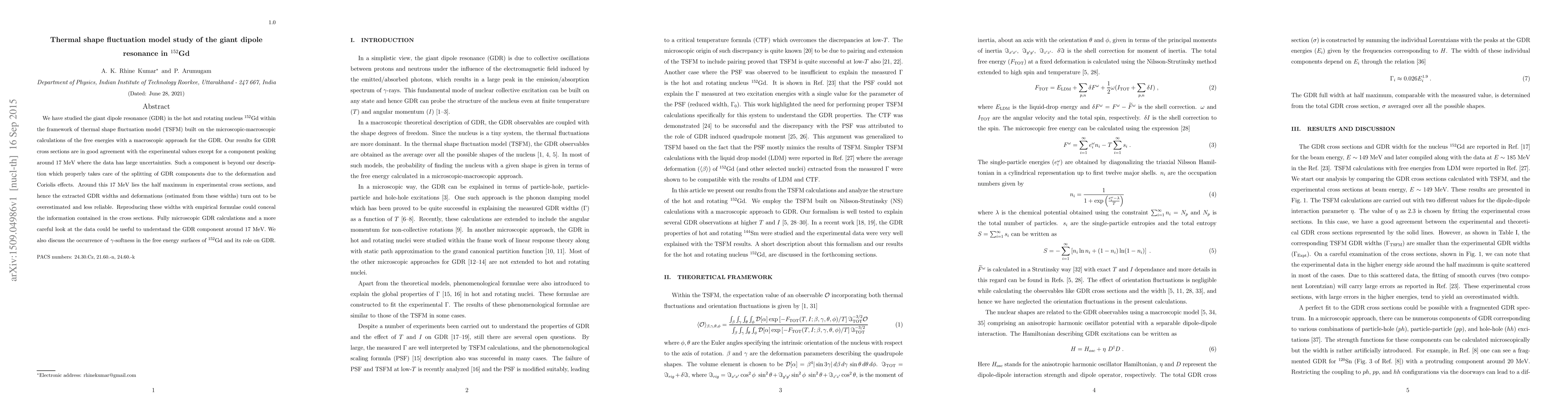 This study investigates the giant dipole resonance (GDR) in $^{152}$Gd using the thermal shape fluctuation model, finding good agreement with experimental data except for a 17 MeV component with large uncertainties. The model's limitations suggest overestimated GDR widths and deformations, highlighting the need for more detailed microscopic calculations and a closer examination of the data.