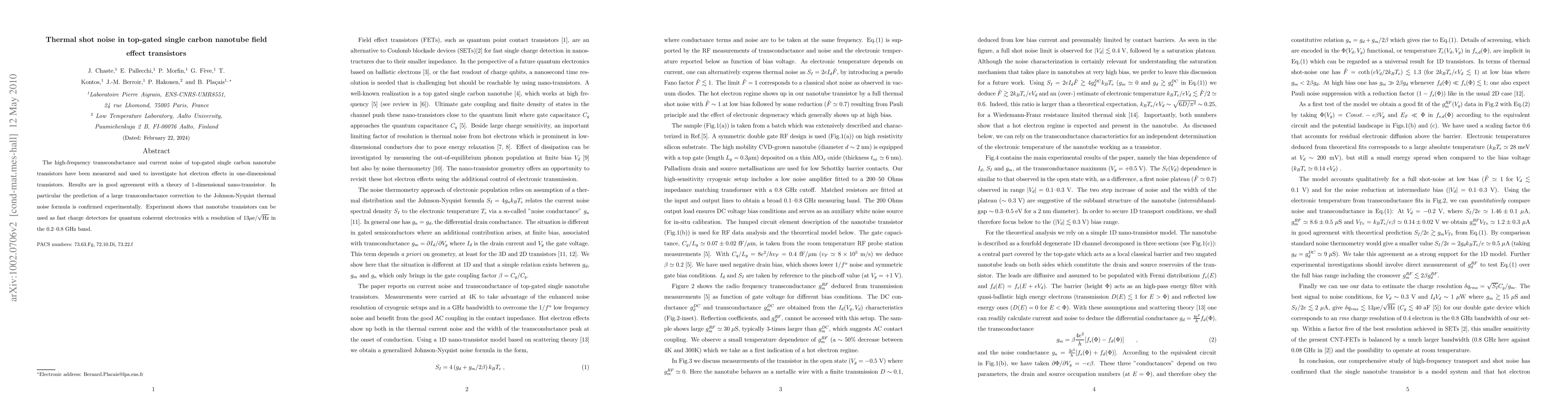 This paper investigates thermal shot noise in top-gated single carbon nanotube FETs, confirming theoretical predictions of significant transconductance corrections to Johnson-Nyquist noise and demonstrating the transistors' potential as high-resolution charge detectors in quantum electronics.