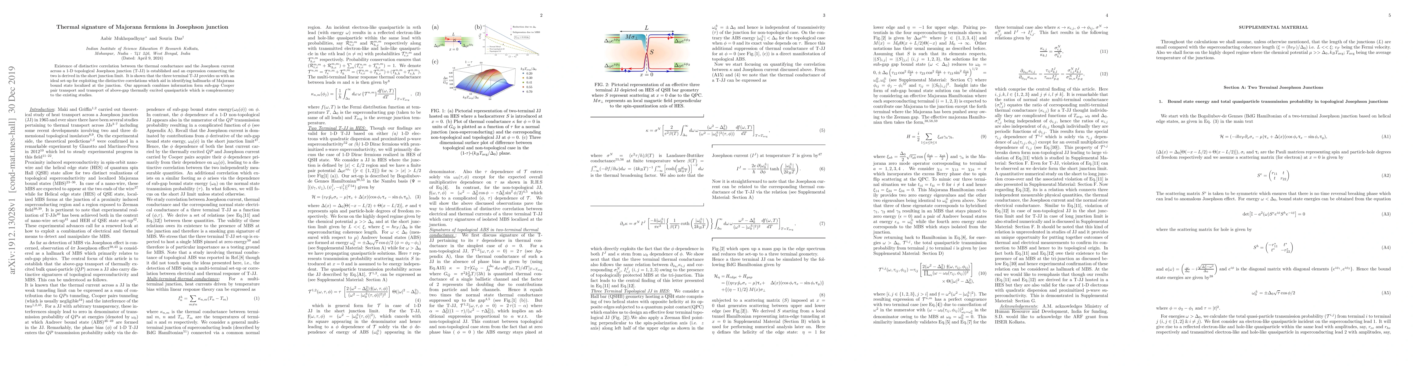 This paper establishes a unique correlation between thermal conductance and Josephson current in a 1-D topological Josephson junction, deriving an expression for this relationship in short junctions. The three-terminal junction provides an ideal setup for identifying Majorana bound states through complementary sub-gap and above-gap quasiparticle transport.
