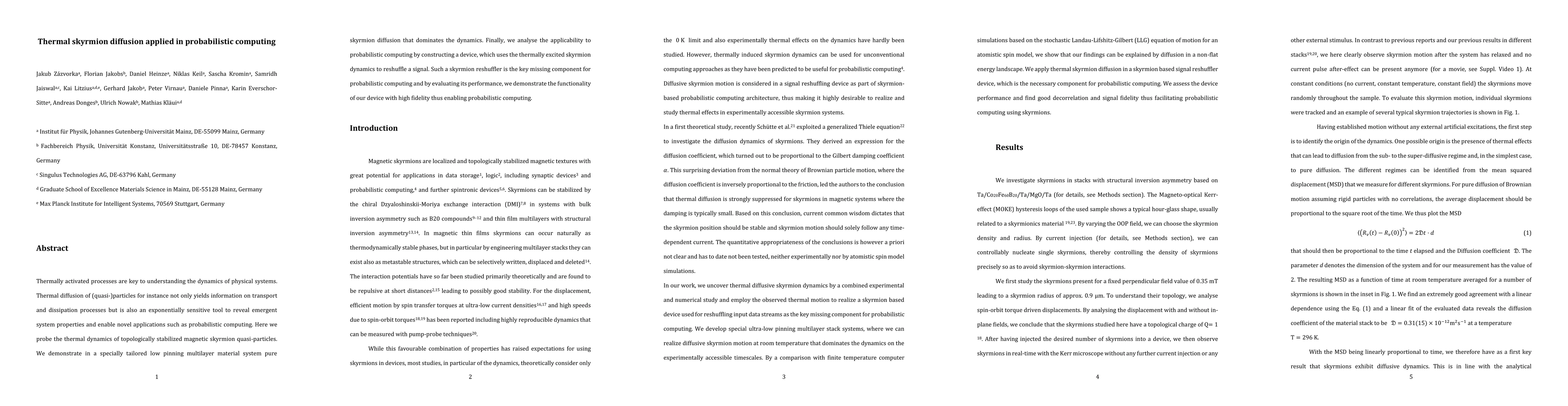 Thermally activated processes are key to understanding the dynamics of physical systems. Thermal diffusion of (quasi-)particles for instance not only yields information on transport and dissipation processes but is also an exponentially sensitive tool to reveal emergent system properties and enable novel applications such as probabilistic computing. Here we probe the thermal dynamics of topologically stabilized magnetic skyrmion quasi-particles. We demonstrate in a specially tailored low pinning multilayer material system pure skyrmion diffusion that dominates the dynamics. Finally, we analyse the applicability to probabilistic computing by constructing a device, which uses the thermally excited skyrmion dynamics to reshuffle a signal. Such a skyrmion reshuffler is the key missing component for probabilistic computing and by evaluating its performance, we demonstrate the functionality of our device with high fidelity thus enabling probabilistic computing.