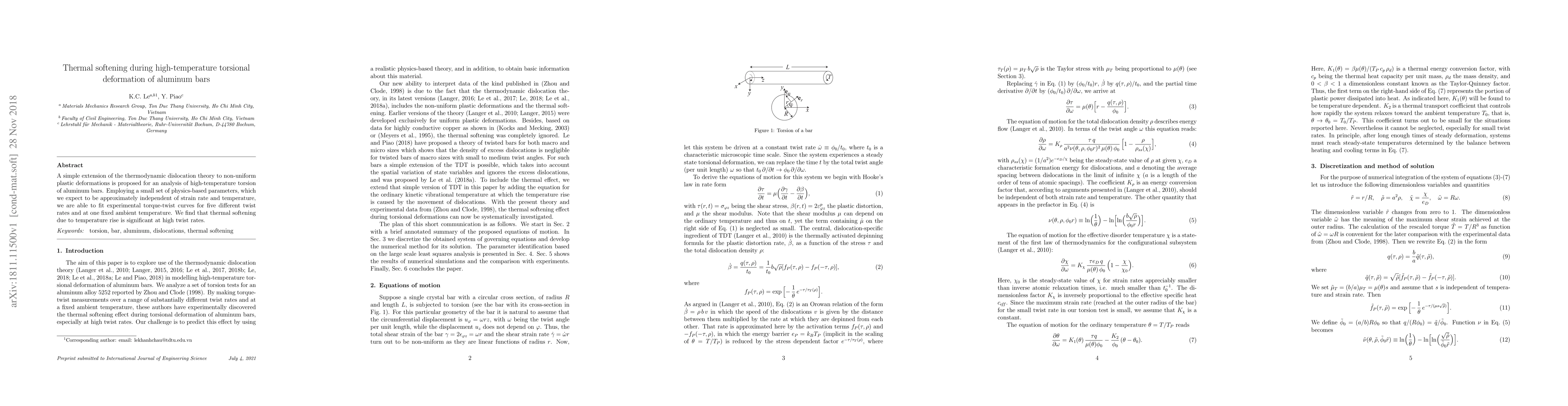A simple extension of the thermodynamic dislocation theory to non-uniform plastic deformations is proposed for an analysis of high-temperature torsion of aluminum bars. Employing a small set of physics-based parameters, which we expect to be approximately independent of strain rate and temperature, we are able to fit experimental torque-twist curves for five different twist rates and at one fixed ambient temperature. We find that thermal softening due to temperature rise is significant at high twist rates.