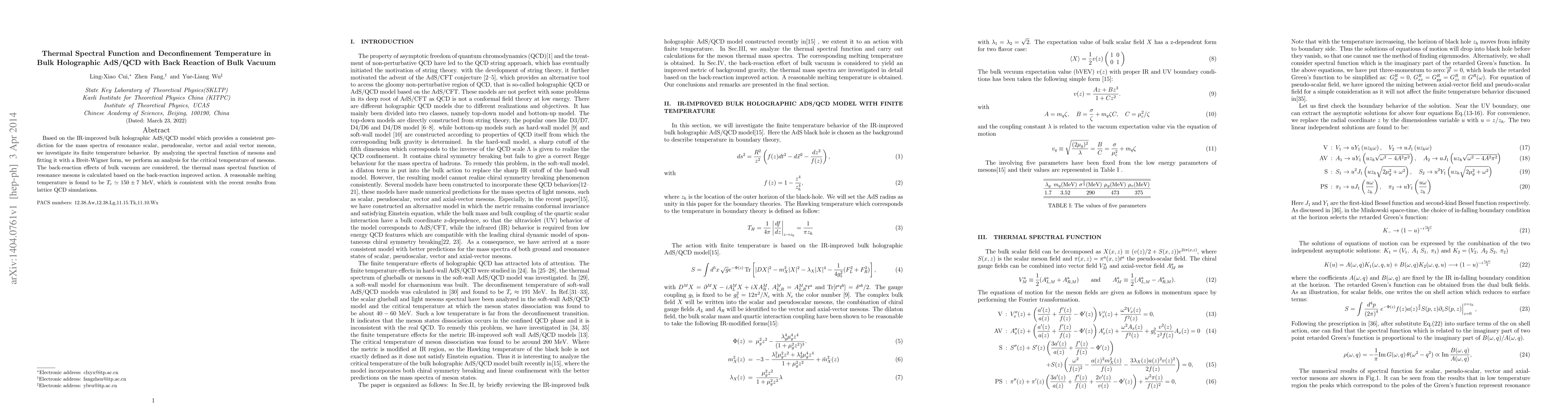 This paper uses the IR-improved holographic AdS/QCD model to study the thermal spectral function and deconfinement temperature, considering the back-reaction effects of the bulk vacuum. It finds a deconfinement temperature of $T_c \simeq 150 \pm 7$ MeV, aligning with lattice QCD results.