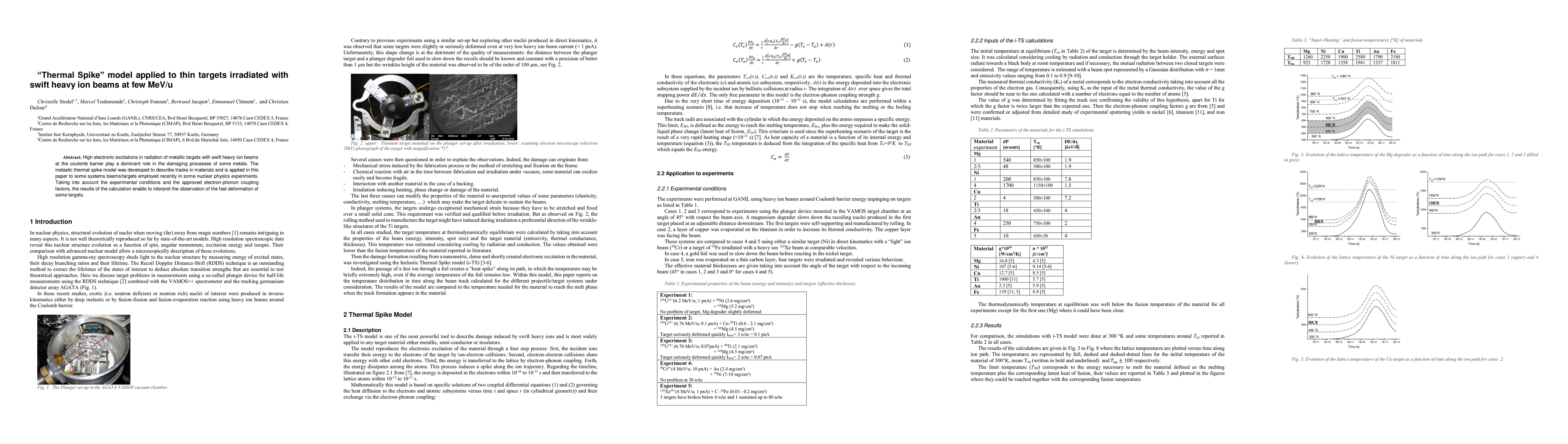 High electronic excitations in radiation of metallic targets with swift heavy ion beams at the coulomb barrier play a dominant role in the damaging processes of some metals. The inelastic thermal spike model was developed to describe tracks in materials and is applied in this paper to some systems beams/targets employed recently in some nuclear physics experiments. Taking into account the experimental conditions and the approved electron-phonon coupling factors, the results of the calculation enable to interpret the observation of the fast deformation of some targets.