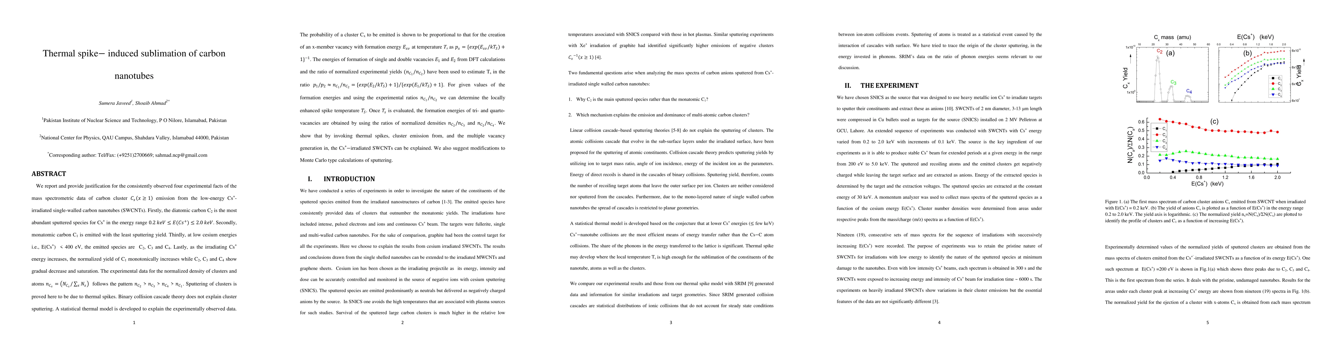 We report and provide justification for the consistently observed four experimental facts of the mass spectrometric data of carbon cluster emission from the low-energy Cs irradiated single-walled carbon nanotubes . Firstly, the diatomic carbon C(2) is the most abundant sputtered species for Cs+ in the energy range 0.2 keV to 2.0 keV. Secondly, monatomic carbon C(1) is emitted with the least sputtering yield. Thirdly, at low cesium energies i the emitted species are C(2), C(3) and C(4). Lastly, as the irradiating Cs+ energy increases, the normalized yield of atomic carbon monotonically increases while clusters show gradual decrease and saturation. Sputtering of clusters is proved here to be due to thermal spikes. Binary collision cascade theory does not explain cluster sputtering. A statistical thermal model is developed to explain the experimentally observed data. The probability of a cluster C(x) to be emitted is shown to be proportional to that for the creation of an x-member vacancy with formation energy E at temperature T as {exp(E/kT)+1}^(-1). The energies of formation of single and double vacancies from DFT calculations and the ratio of normalized experimental yields have been used to estimate spike temperature. We show that by invoking thermal spikes, cluster emission from, and the multiple vacancy generation in, the Cs+-irradiated SWCNTs can be explained. We also suggest modifications to Monte Carlo type calculations of sputtering.