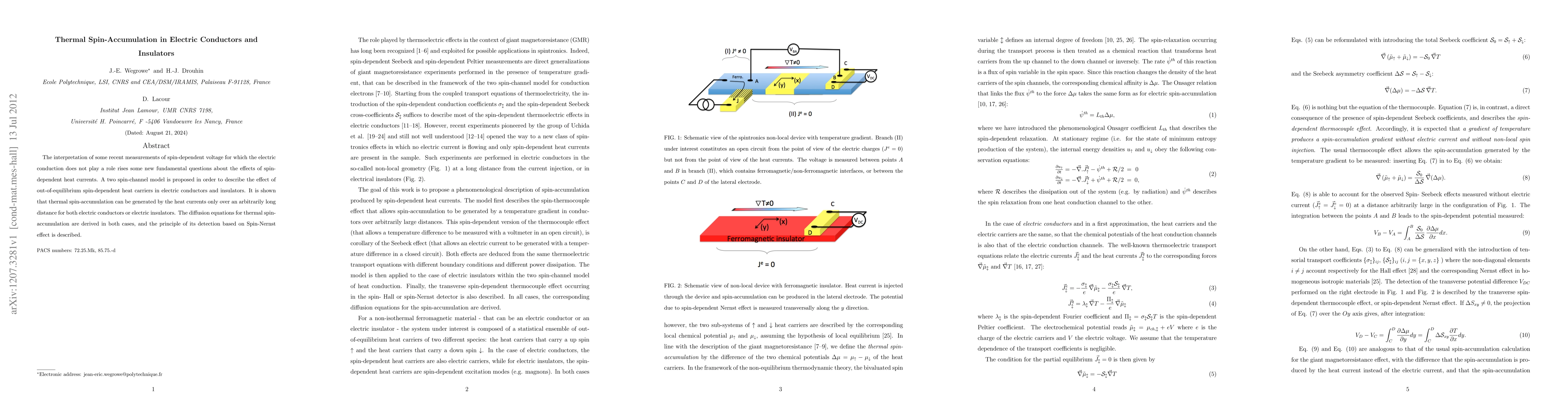 The interpretation of some recent measurements of spin-dependent voltage for which the electric conduction does not play a role rises some new fundamental questions about the effects of spin-dependent heat currents. A two spin-channel model is proposed in order to describe the effect of out-of-equilibrium spin-dependent heat carriers in electric conductors and insulators. It is shown that thermal spin-accumulation can be generated by the heat currents only over an arbitrarily long distance for both electric conductors or electric insulators. The diffusion equations for thermal spin-accumulation are derived in both cases, and the principle of its detection based on Spin-Nernst effect is described.