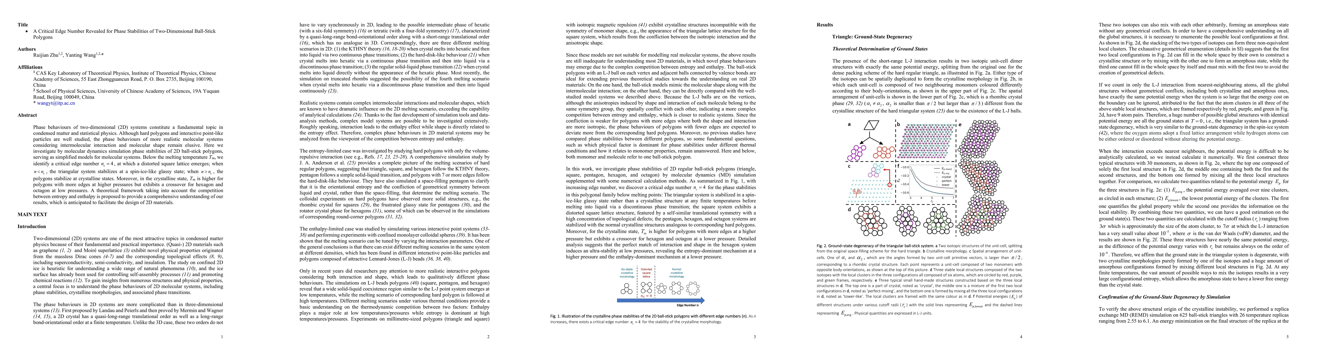 Phase behaviors of two-dimensional (2D) systems locate as a fundamental topic in condensed matter and statistical physics. Although hard polygons and interactive point-like particles are well studied, the phase behaviors of more realistic molecular systems containing intermolecular interaction and molecular shape remain elusive. Here we investigate by molecular dynamics simulation thermal stabilities of 2D ball-stick polygons, serving as simplified models for molecular systems. Below the melting temperature $T_{m}$, we identify a critical edge number $n_{c}$, at which a waving superlattice structure emerges; when n < $n_{c}$,the triangular system stabilizes at a spin-ice-like glassy state; when n > $n_{c}$,the polygons stabilize at crystalline states, and $T_{m}$ is higher for polygons with more edges at higher pressures but exhibits a crossover for hexagon and octagon at low pressures. A theoretical framework considering the competition between entropy and enthalpy is proposed to provide a comprehensive understanding of our results, which is anticipated to facilitate the design of 2D materials.