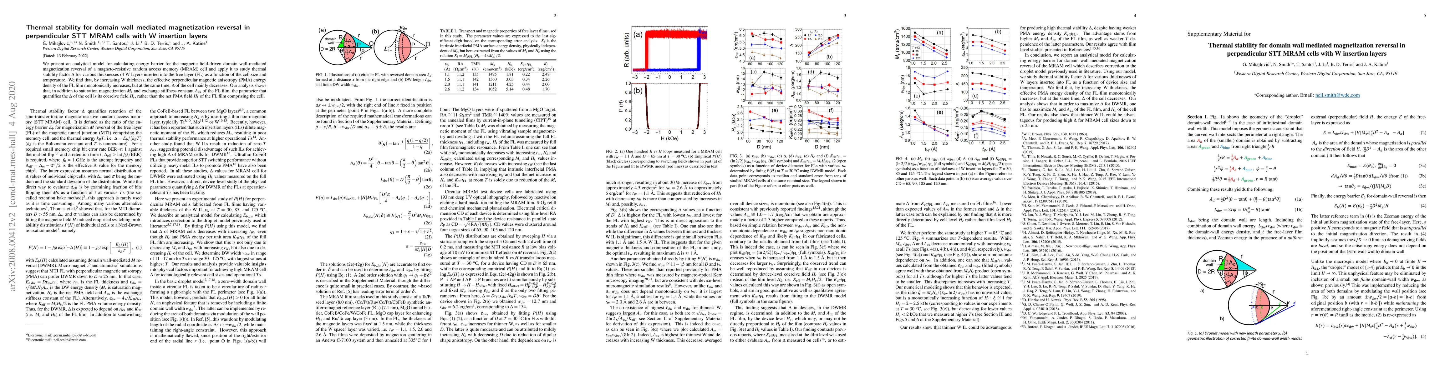 This research presents an analytical model to calculate energy barriers for domain wall-mediated magnetization reversal in MRAM cells with W insertion layers. It finds that while W thickness increases effective PMA energy, it decreases thermal stability factor Δ. The study reveals that a cell's coercive field H_c, not the net PMA field H_k, primarily influences Δ.