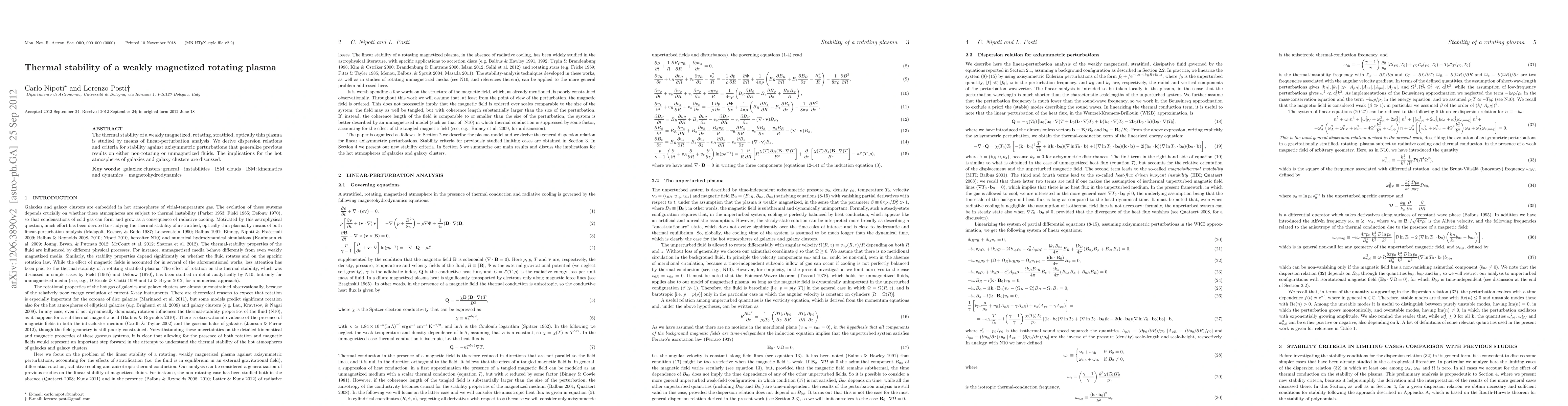 This paper investigates the thermal stability of weakly magnetized, rotating plasmas through linear-perturbation analysis, deriving new dispersion relations and stability criteria that extend previous findings. The study has implications for understanding the hot atmospheres in galaxies and galaxy clusters.