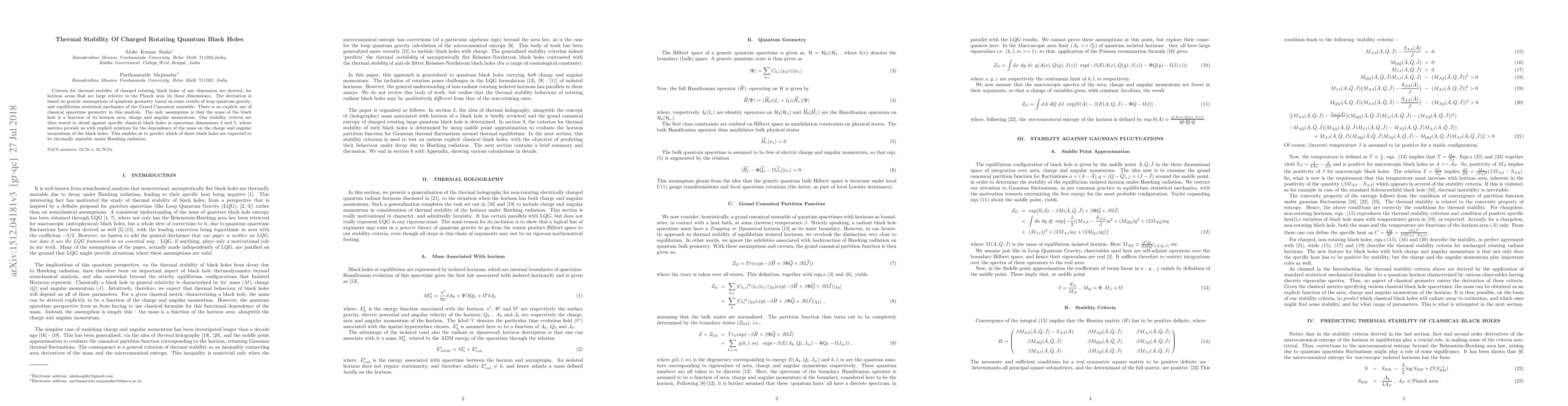 This paper derives criteria for thermal stability of charged rotating black holes using quantum geometry from loop quantum gravity and statistical mechanics, predicting thermal instability for specific black holes in dimensions 4 and 5 under Hawking radiation. The analysis avoids classical spacetime geometry, relying solely on mass-area-charge-angular momentum relations.