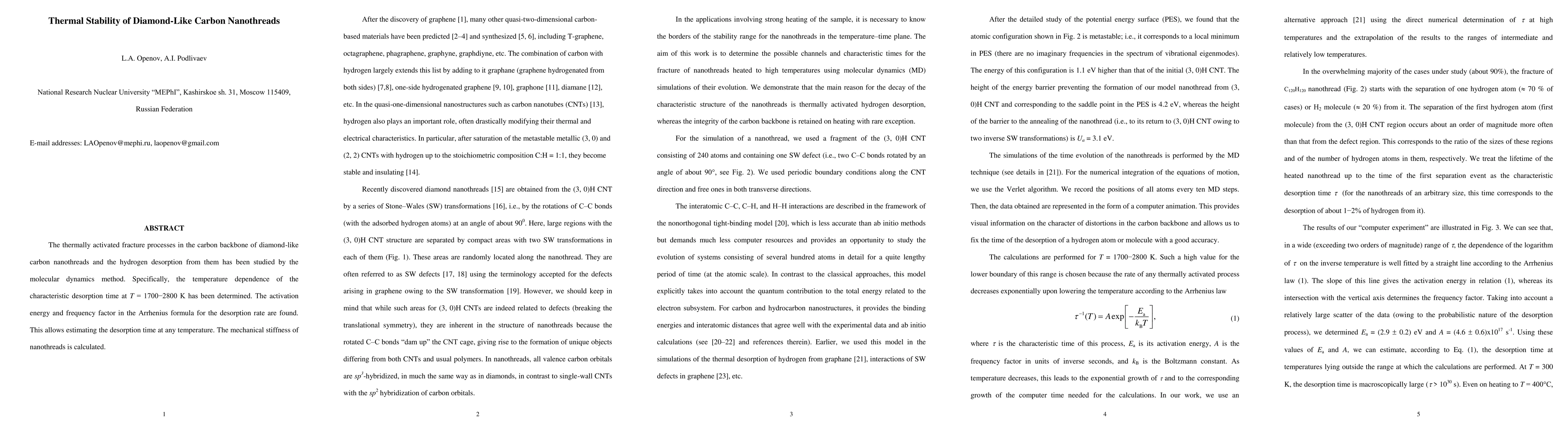 This study uses molecular dynamics to analyze the thermal stability of diamond-like carbon nanothreads, determining temperature dependence for hydrogen desorption and calculating activation energy, frequency factor, and mechanical stiffness.