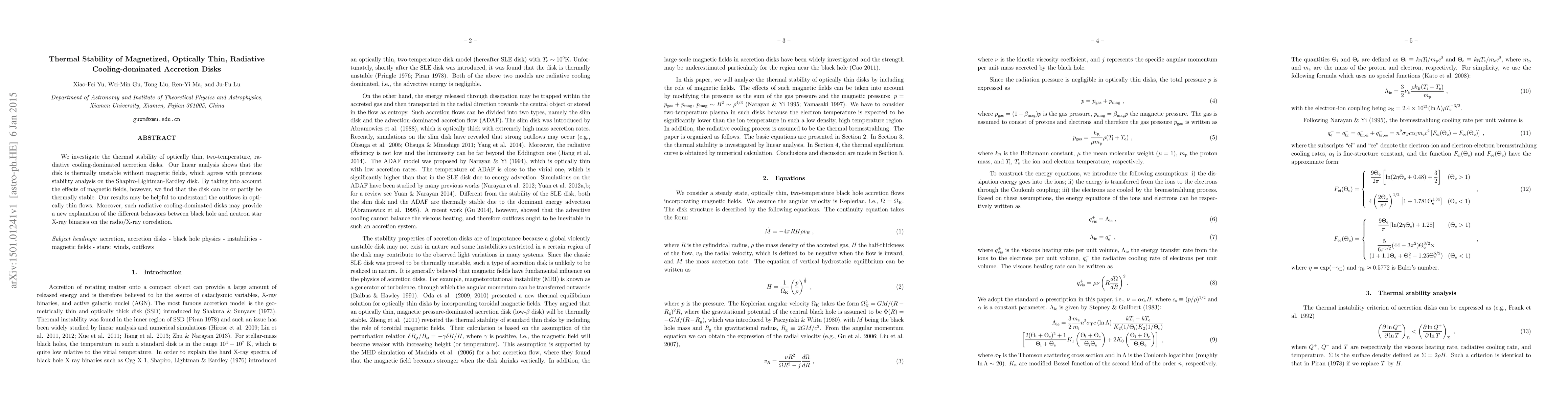 This paper examines the thermal stability of magnetized, optically thin accretion disks dominated by radiative cooling. Without magnetic fields, the disks are found to be thermally unstable, but with magnetic fields, they can achieve partial thermal stability, potentially explaining differences in radio/X-ray correlations between black hole and neutron star X-ray binaries.