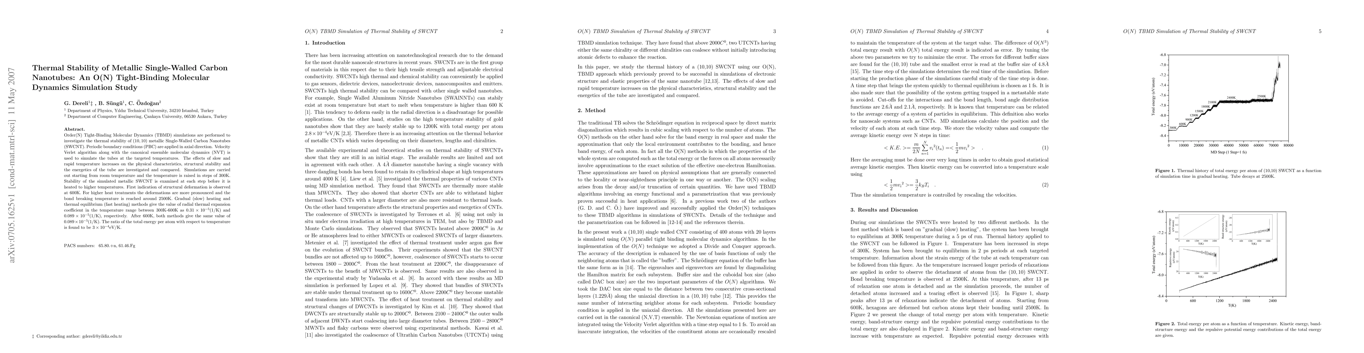 This study uses O(N) Tight-Binding Molecular Dynamics simulations to investigate the thermal stability of metallic (10,10) Single-Walled Carbon Nanotubes (SWCNT). The simulations reveal that structural deformation begins at 600K, with significant bond breaking occurring around 2500K. The radial thermal expansion coefficient is 0.31x10^{-5}(1/K) for slow heating and 0.089x10^{-5}(1/K) for rapid heating between 300K-600K.