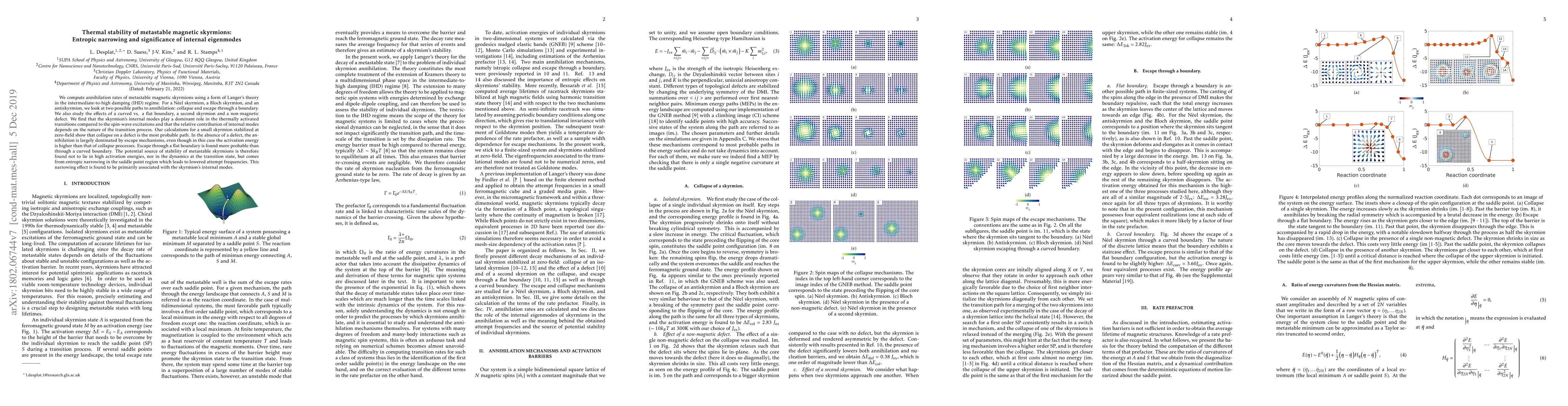 We compute annihilation rates of metastable magnetic skyrmions using a form of Langer's theory in the intermediate-to-high damping (IHD) regime. For a N\'eel skyrmion, a Bloch skyrmion, and an antiskyrmion, we look at two possible paths to annihilation: collapse and escape through a boundary. We also study the effects of a curved vs. a flat boundary, a second skyrmion and a non-magnetic defect. We find that the skyrmion's internal modes play a dominant role in the thermally activated transitions compared to the spin-wave excitations and that the relative contribution of internal modes depends on the nature of the transition process. Our calculations for a small skyrmion stabilized at zero-field show that collapse on a defect is the most probable path. In the absence of a defect, the annihilation is largely dominated by escape mechanisms, even though in this case the activation energy is higher than that of collapse processes. Escape through a flat boundary is found more probable than through a curved boundary. The potential source of stability of metastable skyrmions is therefore found not to lie in high activation energies, nor in the dynamics at the transition state, but comes from entropic narrowing in the saddle point region which leads to lowered attempt frequencies. This narrowing effect is found to be primarily associated with the skyrmion's internal modes.