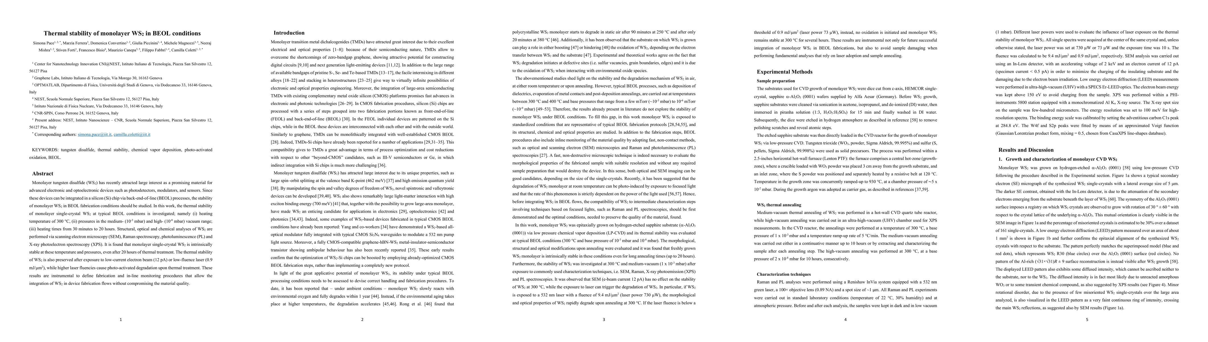 Monolayer tungsten disulfide ($WS_2$) has recently attracted large interest as a promising material for advanced electronic and optoelectronic devices such as photodetectors, modulators, and sensors. Since these devices can be integrated in a silicon (Si) chip via back-end-of-line (BEOL) processes, the stability of monolayer $WS_2$ in BEOL fabrication conditions should be studied. In this work, the thermal stability of monolayer single-crystal $WS_2$ at typical BEOL conditions is investigated; namely (i) heating temperature of $300$ $^\circ C$, (ii) pressures in the medium- ($10^{-3}$ mbar) and high- ($10^{-8}$ mbar) vacuum range; (iii) heating times from $30$ minutes to $20$ hours. Structural, optical and chemical analyses of $WS_2$ are performed via scanning electron microscopy (SEM), Raman spectroscopy, photoluminescence (PL) and X-ray photoelectron spectroscopy (XPS). It is found that monolayer single-crystal $WS_2$ is intrinsically stable at these temperature and pressures, even after $20$ hours of thermal treatment. The thermal stability of $WS_2$ is also preserved after exposure to low-current electron beam ($12$ pA) or low-fluence laser ($0.9$ $mJ/\mu m^2$), while higher laser fluencies cause photo-activated degradation upon thermal treatment. These results are instrumental to define fabrication and in-line monitoring procedures that allow the integration of $WS_2$ in device fabrication flows without compromising the material quality.