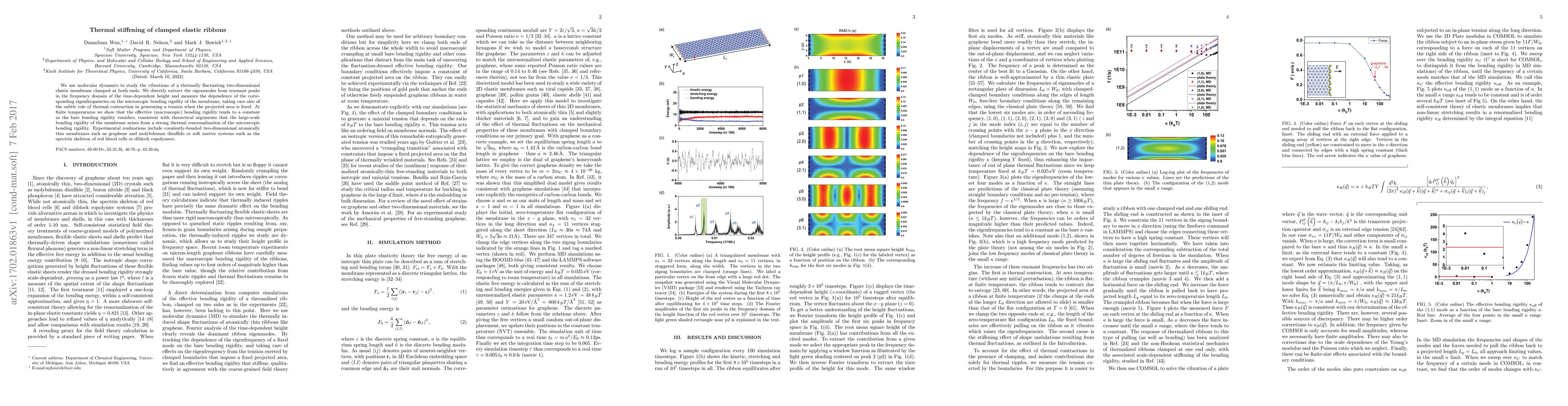 Researchers used molecular dynamics to study how temperature affects the bending stiffness of a clamped elastic ribbon, finding that it tends to a constant value at finite temperatures. This phenomenon is consistent with theoretical arguments about thermal renormalization of microscopic bending rigidity.