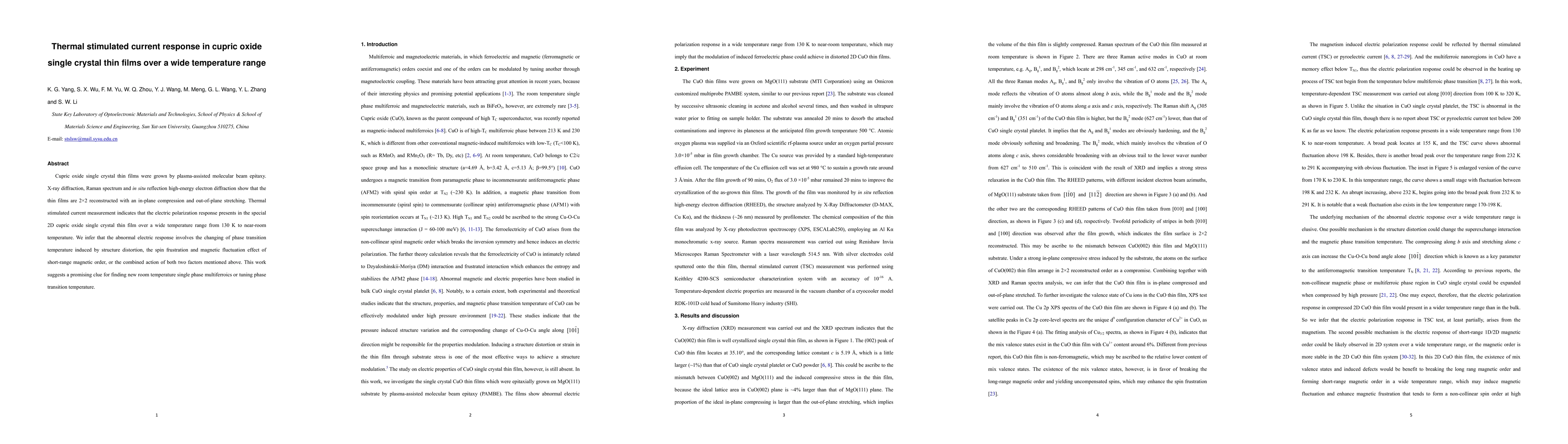 Cupric oxide single crystal thin films were grown by plasma-assisted molecular beam epitaxy. X-ray diffraction, Raman spectrum and in situ reflection high-energy electron diffraction show that the thin films are 2x2 reconstructed with an in-plane compression and out-of-plane stretching. Thermal stimulated current measurement indicates that the electric polarization response presents in the special 2D cupric oxide single crystal thin film over a wide temperature range from 130 K to near-room temperature. We infer that the abnormal electric response involves the changing of phase transition temperature induced by structure distortion, the spin frustration and magnetic fluctuation effect of short-range magnetic order, or the combined action of both two factors mentioned above. This work suggests a promising clue for finding new room temperature single phase multiferroics or tuning phase transition temperature.
