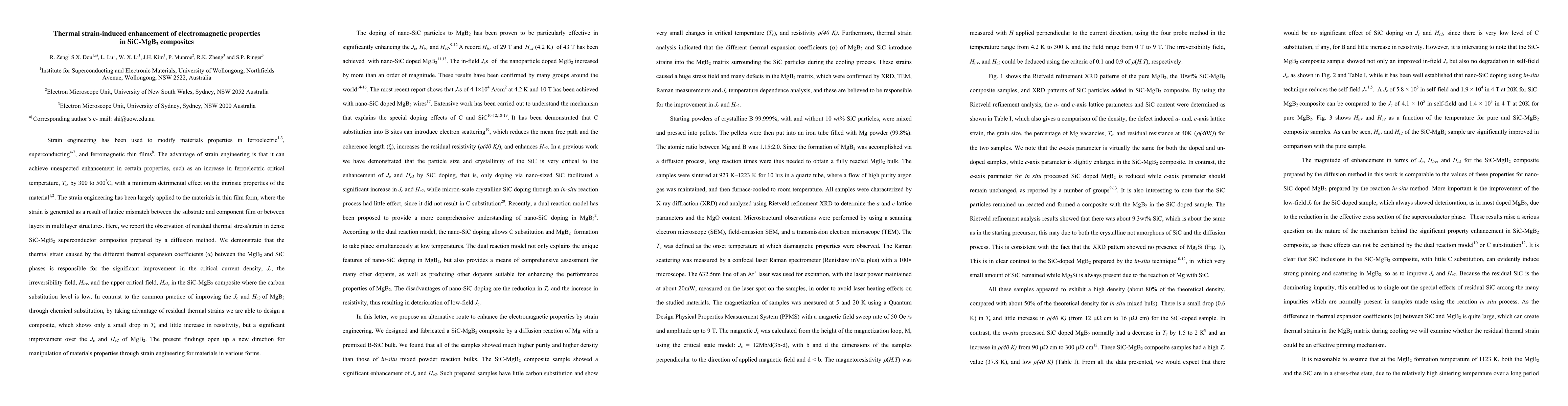 This paper demonstrates that thermal strain from the different thermal expansion coefficients in SiC-MgB2 composites enhances electromagnetic properties, notably critical current density, irreversibility field, and upper critical field, without significantly affecting critical temperature. This strain engineering approach offers a new method for improving superconducting properties in composites.