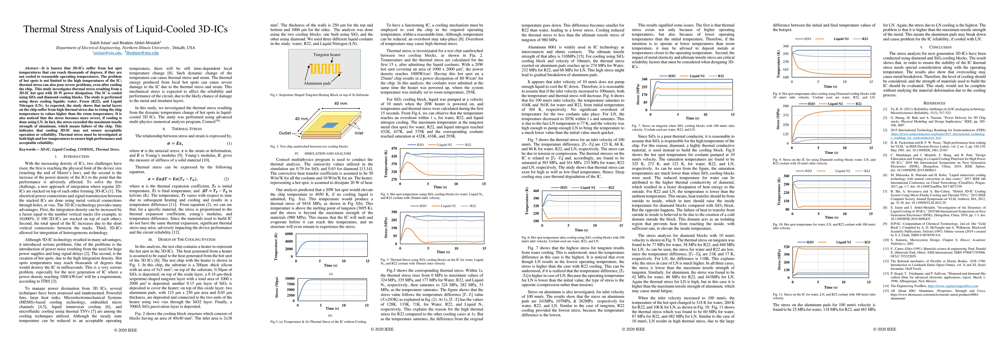 It is known that 3D-ICs suffer from hot spot temperatures that can reach thousands of degrees, if they are not cooled to reasonable operating temperatures. The problem of hot spots is not limited to the high temperatures of the IC; thermal stress can also pose severe problems, even after cooling the chip. This study investigates thermal stress resulting from a 3D-IC hot spot with 20 W power dissipation. The IC is cooled using SiO2 and diamond cooling blocks. The study is performed using three cooling liquids: water, Freon (R22), and Liquid Nitrogen (LN). As expected, the study shows that metal layers on the chip suffer from high thermal stress due to rising the chip temperature to values higher than the room temperature. It is also noticed that the stress becomes more severe, if cooling is done using LN. In fact, the stress exceeded the maximum tensile strength of aluminum, which means failure of the chip. This indicates that cooling 3D-IC may not ensure acceptable operation or reliability. Thermal stress must be investigated at both high and low temperatures to ensure high performance and acceptable reliability.
