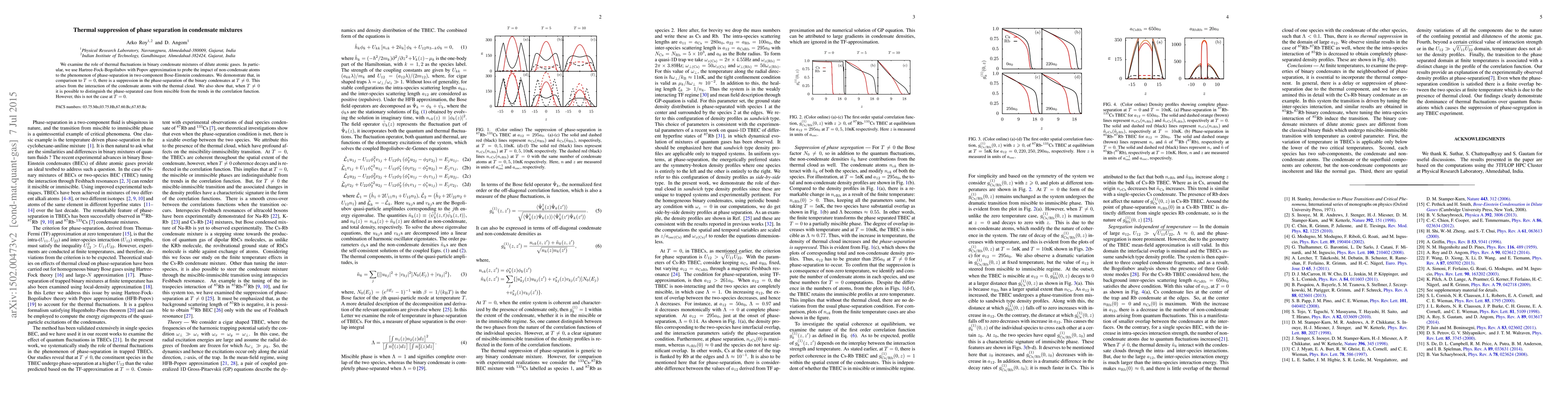 We examine the role of thermal fluctuations in binary condensate mixtures of dilute atomic gases. In particular, we use Hartree-Fock-Bogoliubov with Popov approximation to probe the impact of non-condensate atoms to the phenomenon of phase-separation in two-component Bose-Einstein condensates. We demonstrate that, in comparison to $T=0$, there is a suppression in the phase-separation of the binary condensates at $T\neq0$. This arises from the interaction of the condensate atoms with the thermal cloud. We also show that, when $T\neq0$ it is possible to distinguish the phase-separated case from miscible from the trends in the correlation function. However, this is not the case at $T=0$.