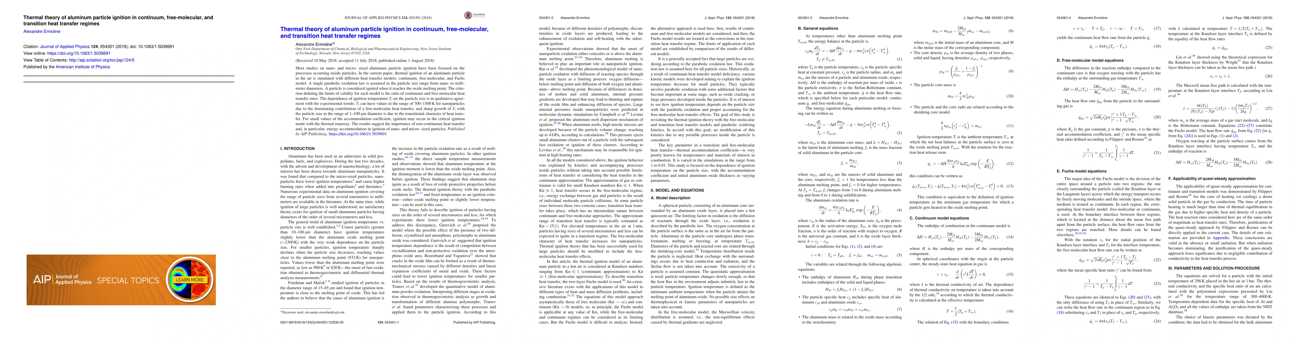 This paper simulates the thermal ignition of aluminum particles in air using continuum, free-molecular, and transition heat transfer models, finding that ignition temperature varies significantly with particle size and heat transfer regime. The study highlights the importance of heat transfer mechanisms and energy accommodation in the ignition process.