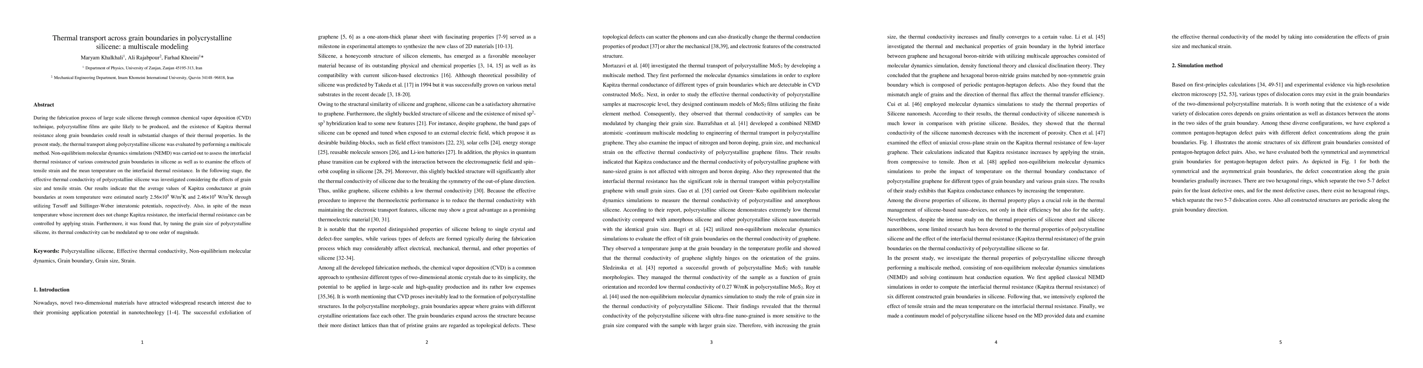 This research evaluates the thermal transport in polycrystalline silicene films, revealing significant Kapitza thermal resistance at grain boundaries. Using multiscale modeling, including NEMD simulations, the study found that tensile strain and grain size can modulate the thermal conductivity, with grain size adjustments potentially altering conductivity by an order of magnitude.