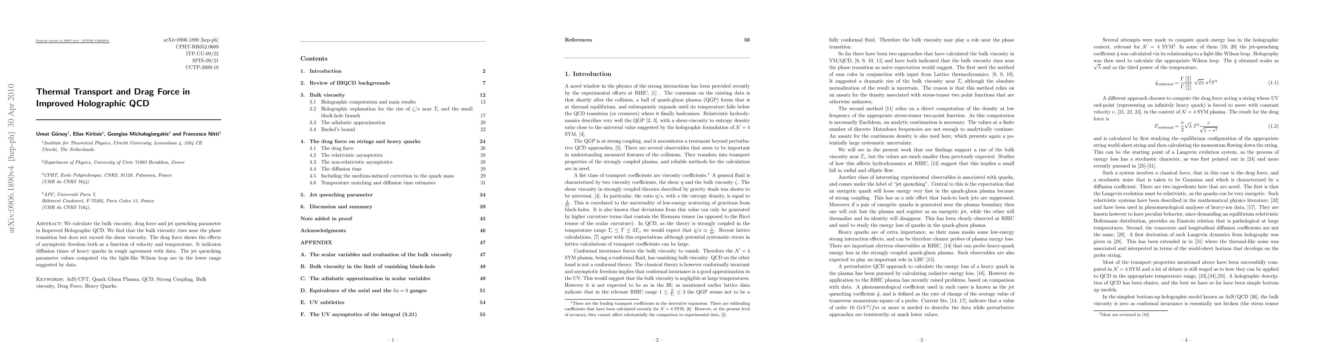 We calculate the bulk viscosity, drag force and jet quenching parameter in Improved Holographic QCD. We find that the bulk viscosity rises near the phase transition but does not exceed the shear viscosity. The drag force shows the effects of asymptotic freedom both as a function of velocity and temperature. It indicates diffusion times of heavy quarks in rough agreement with data. The jet quenching parameter values computed via the light-like Wilson loop are in the lower range suggested by data.