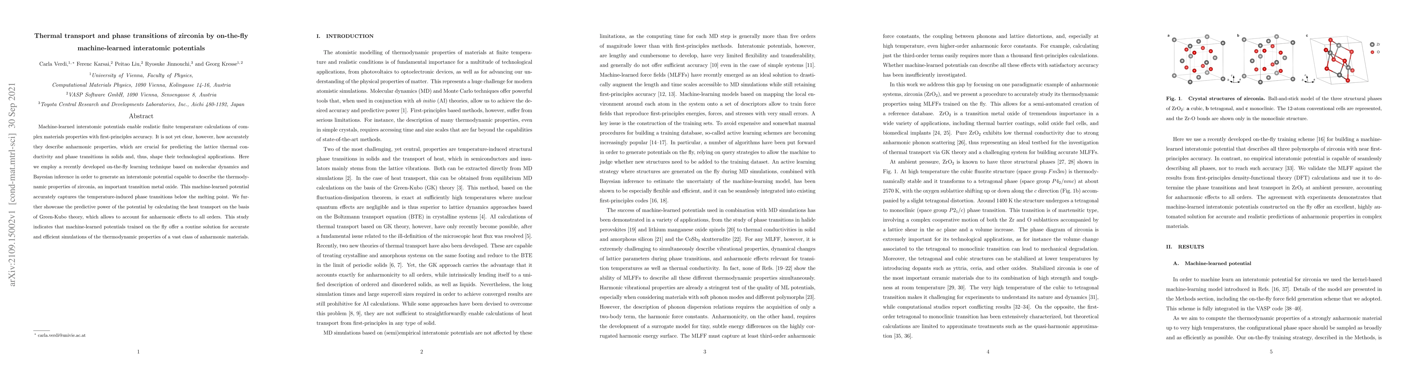 This paper develops an on-the-fly machine-learned interatomic potential to accurately describe the thermal transport and phase transitions in zirconia. It demonstrates the potential's ability to capture temperature-induced phase changes and predict lattice thermal conductivity, indicating a promising method for simulating thermodynamic properties of anharmonic materials.