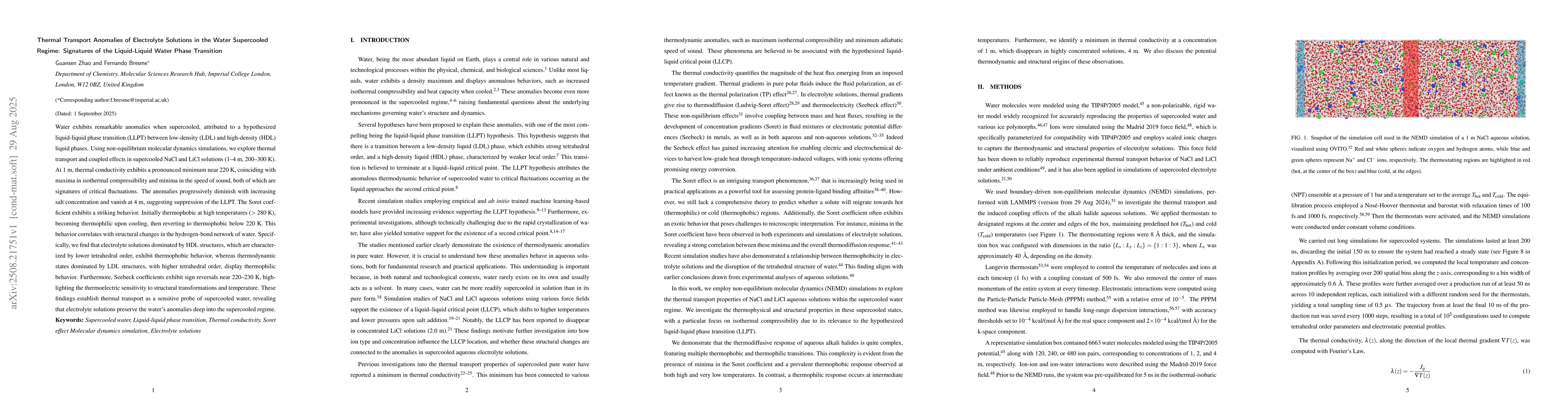 Water exhibits remarkable anomalies when supercooled, attributed to a hypothesized liquid-liquid phase transition (LLPT) between low-density (LDL) and high-density (HDL) liquid phases. Using non-equilibrium molecular dynamics simulations, we explore thermal transport and coupled effects in supercooled NaCl and LiCl solutions (1-4 m, 200-300 K). At 1 m, thermal conductivity exhibits a pronounced minimum near 220 K, coinciding with maxima in isothermal compressibility and minima in the speed of sound, both of which are signatures of critical fluctuations. The anomalies progressively diminish with increasing salt concentration and vanish at 4 m, suggesting suppression of the LLPT. The Soret coefficient exhibits a striking behavior. Initially thermophobic at high temperatures (> 280 K), becoming thermophilic upon cooling, then reverting to thermophobic below 220 K. This behavior correlates with structural changes in the hydrogen-bond network of water. Specifically, we find that electrolyte solutions dominated by HDL structures, which are characterized by lower tetrahedral order, exhibit thermophobic behavior, whereas thermodynamic states dominated by LDL structures, with higher tetrahedral order, display thermophilic behavior. Furthermore, Seebeck coefficients exhibit sign reversals near 220-230 K, highlighting the thermoelectric sensitivity to structural transformations and temperature. These findings establish thermal transport as a sensitive probe of supercooled water, revealing that electrolyte solutions preserve the water's anomalies deep into the supercooled regime.