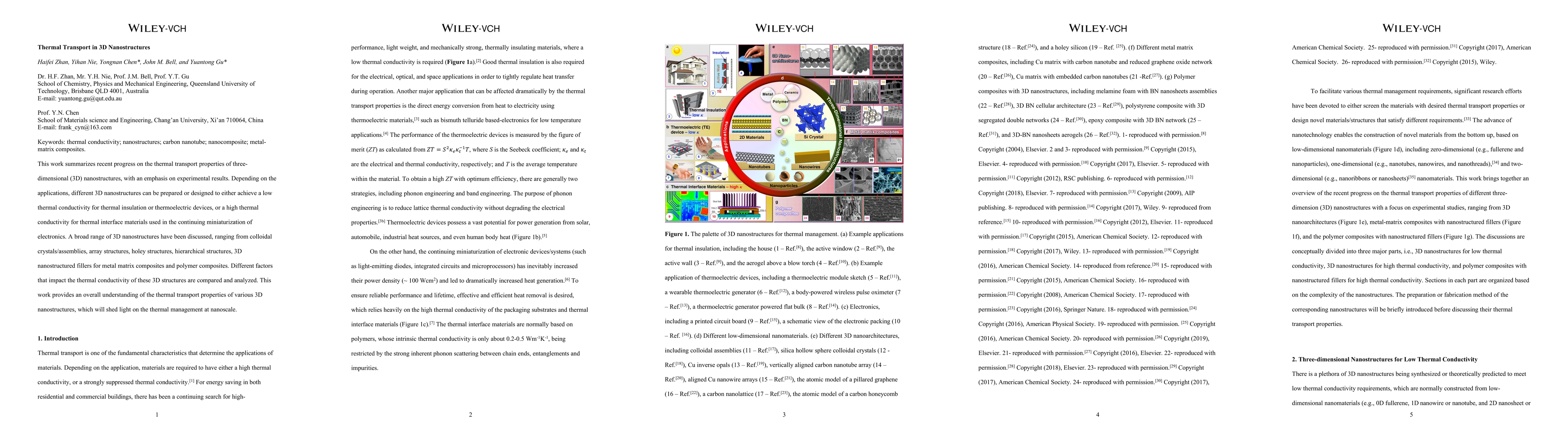 This paper reviews experimental advancements in thermal transport properties of various 3D nanostructures, highlighting their design for applications requiring either low or high thermal conductivity, and discusses factors influencing these properties. It provides insights into nanoscale thermal management.