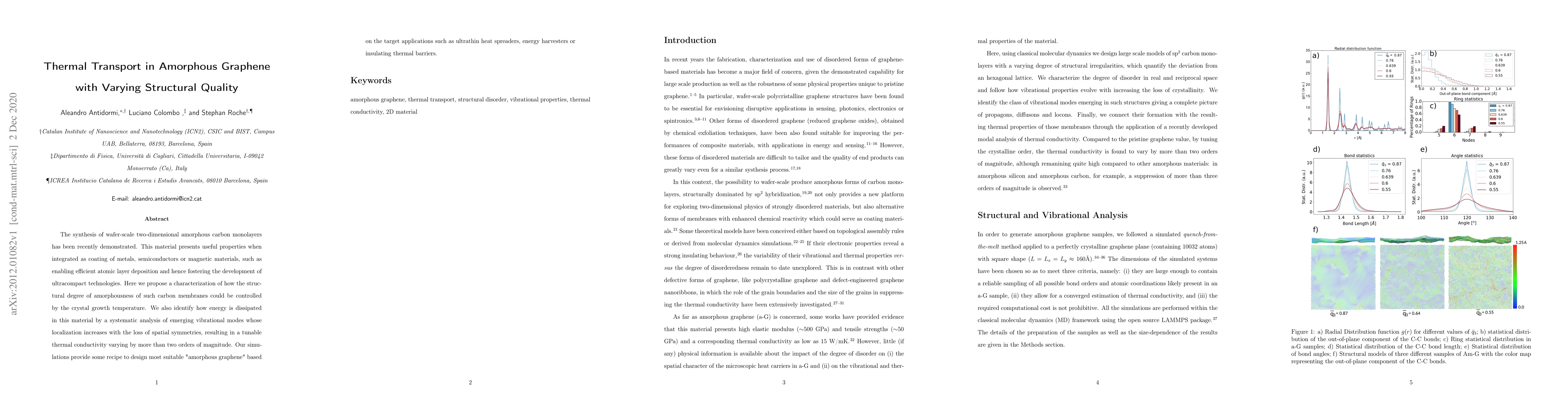 This paper investigates the thermal transport properties of amorphous graphene, demonstrating that its thermal conductivity can vary by over two orders of magnitude depending on its structural quality, which is controlled by the growth temperature. The study identifies localized vibrational modes as a key factor in energy dissipation, offering insights for designing amorphous graphene for applications like heat spreaders and insulators.