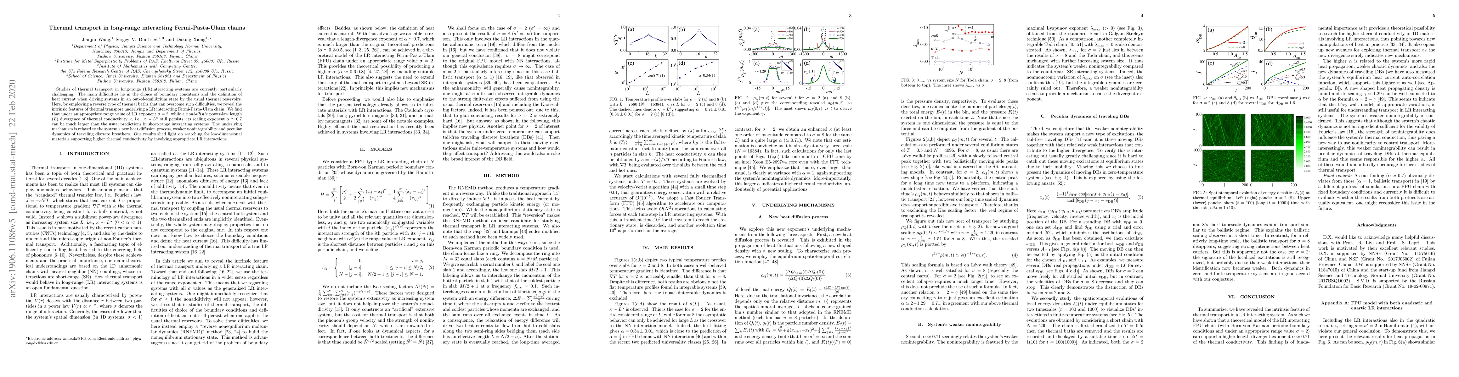 The work distinguishes itself by employing reverse thermal baths to overcome conventional challenges in defining heat current and boundary conditions, uncovering a new heat diffusion process, and identifying the role of weaker nonintegrability and traveling discrete breathers in enhancing thermal conductivity in LR interacting systems.