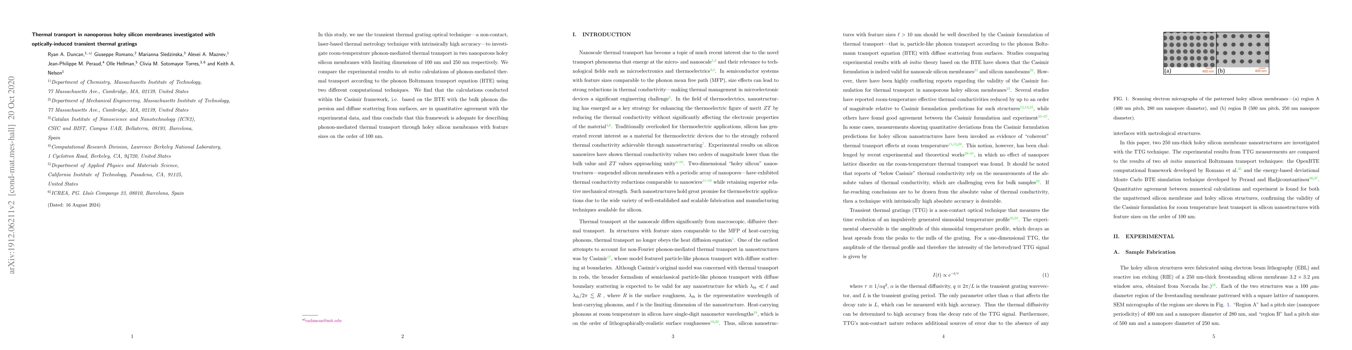 In this study, we use the transient thermal grating optical technique \textemdash a non-contact, laser-based thermal metrology technique with intrinsically high accuracy \textemdash to investigate room-temperature phonon-mediated thermal transport in two nanoporous holey silicon membranes with limiting dimensions of 100 nm and 250 nm respectively. We compare the experimental results to ab initio calculations of phonon-mediated thermal transport according to the phonon Boltzmann transport equation (BTE) using two different computational techniques. We find that the calculations conducted within the Casimir framework, i.e. based on the BTE with the bulk phonon dispersion and diffuse scattering from surfaces, are in quantitative agreement with the experimental data, and thus conclude that this framework is adequate for describing phonon-mediated thermal transport through holey silicon membranes with feature sizes on the order of 100 nm.