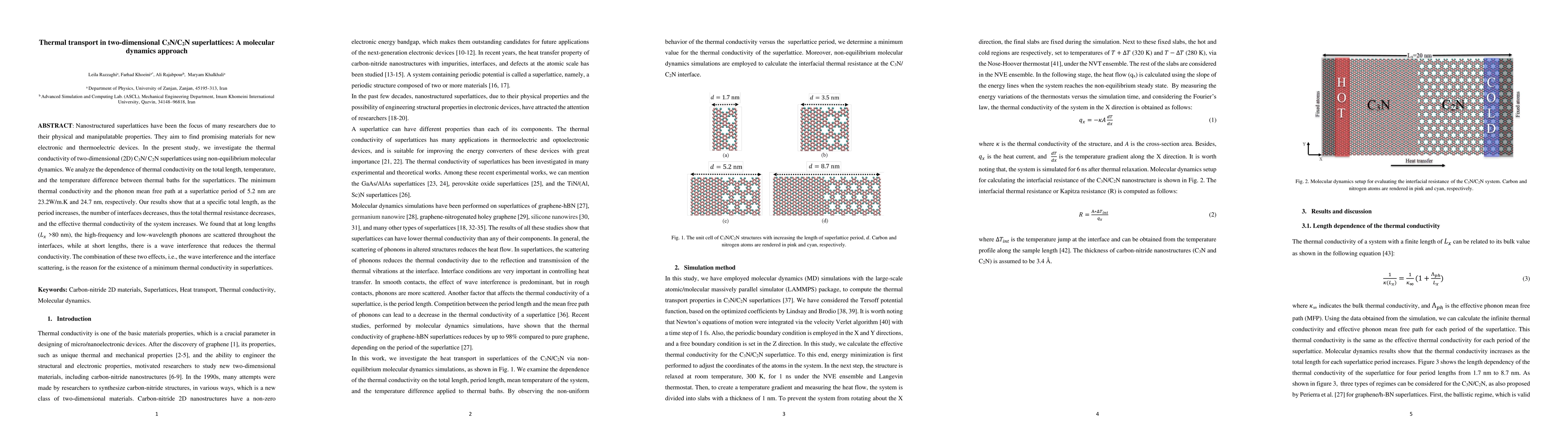 Nanostructured superlattices have been the focus of many researchers due to their physical and manipulatable properties. They aim to find promising materials for new electronic and thermoelectric devices. In the present study, we investigate the thermal conductivity of two-dimensional (2D) C3N/ C2N superlattices using non-equilibrium molecular dynamics. We analyze the dependence of thermal conductivity on the total length, temperature, and the temperature difference between thermal baths for the superlattices. The minimum thermal conductivity and the phonon mean free path at a superlattice period of 5.2 nm are 23.2W/m.K and 24.7 nm, respectively. Our results show that at a specific total length, as the period increases, the number of interfaces decreases, thus the total thermal resistance decreases, and the effective thermal conductivity of the system increases. We found that at long lengths (L_x >80 nm), the high-frequency and low-wavelength phonons are scattered throughout the interfaces, while at short lengths, there is a wave interference that reduces the thermal conductivity. The combination of these two effects, i.e., the wave interference and the interface scattering, is the reason for the existence of a minimum thermal conductivity in superlattices.