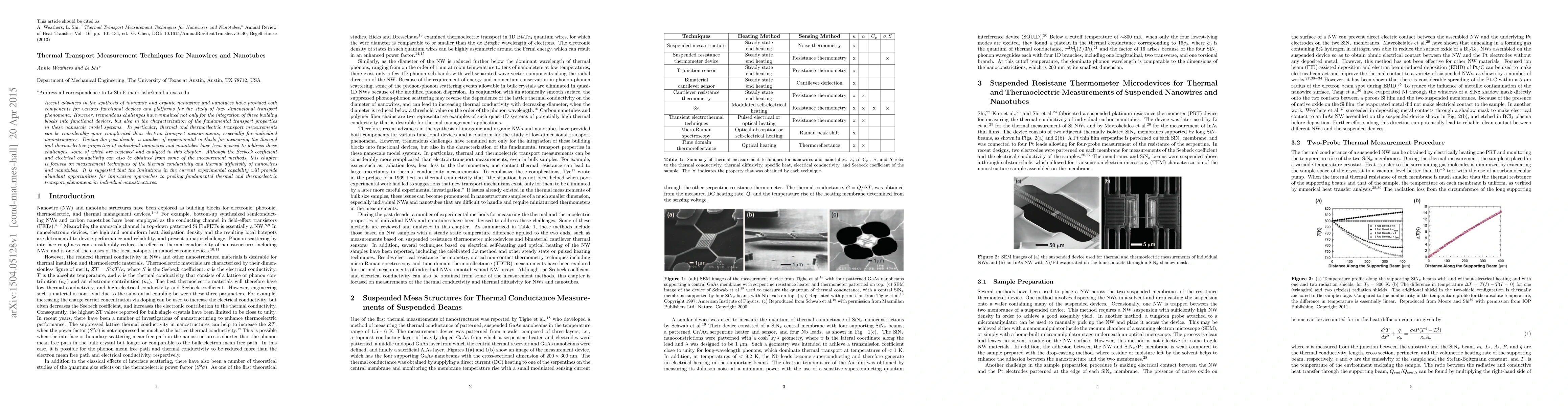 Recent advances in the synthesis of inorganic and organic nanowires and nanotubes have provided both components for various functional devices and platforms for the study of low- dimensional transport phenomena. However, tremendous challenges have remained not only for the integration of these building blocks into functional devices, but also in the characterization of the fundamental transport properties in these nanoscale model systems. In particular, thermal and thermoelectric transport measurements can be considerably more complicated than electron transport measurements, especially for individual nanostructures. During the past decade, a number of experimental methods for measuring the thermal and thermoelectric properties of individual nanowires and nanotubes have been devised to address these challenges, some of which are reviewed and analyzed in this chapter. Although the Seebeck coefficient and electrical conductivity can also be obtained from some of the measurement methods, this chapter is focused on measurement techniques of the thermal conductivity and thermal diffusivity of nanowires and nanotubes. It is suggested that the limitations in the current experimental capability will provide abundant opportunities for innovative approaches to probing fundamental thermal and thermoelectric transport phenomena in individual nanostructures.