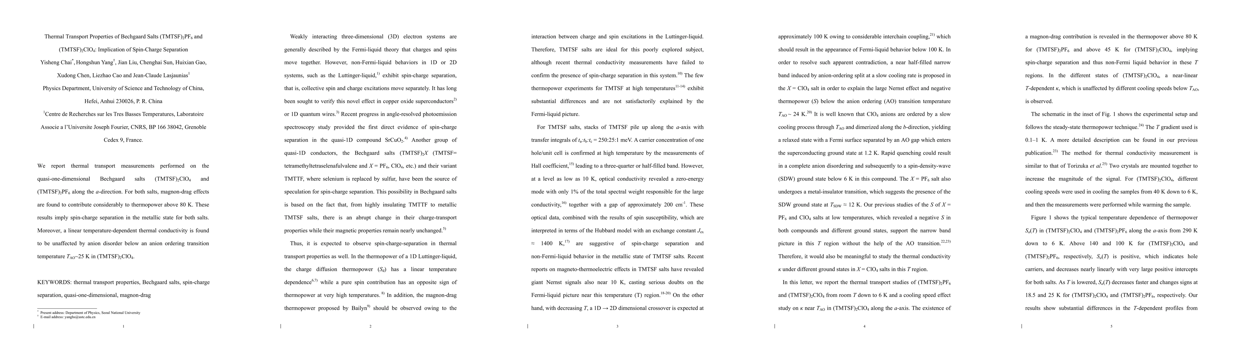 Summary: Thermal transport measurements on Bechgaard salts (TMTSF)2ClO4 and (TMTSF)2PF6 reveal significant magnon-drag effects contributing to thermopower above 80 K, indicating spin-charge separation in the metallic state. In (TMTSF)2ClO4, thermal conductivity remains linear and unaffected by anion disorder below the anion ordering transition temperature TAO~25 K.