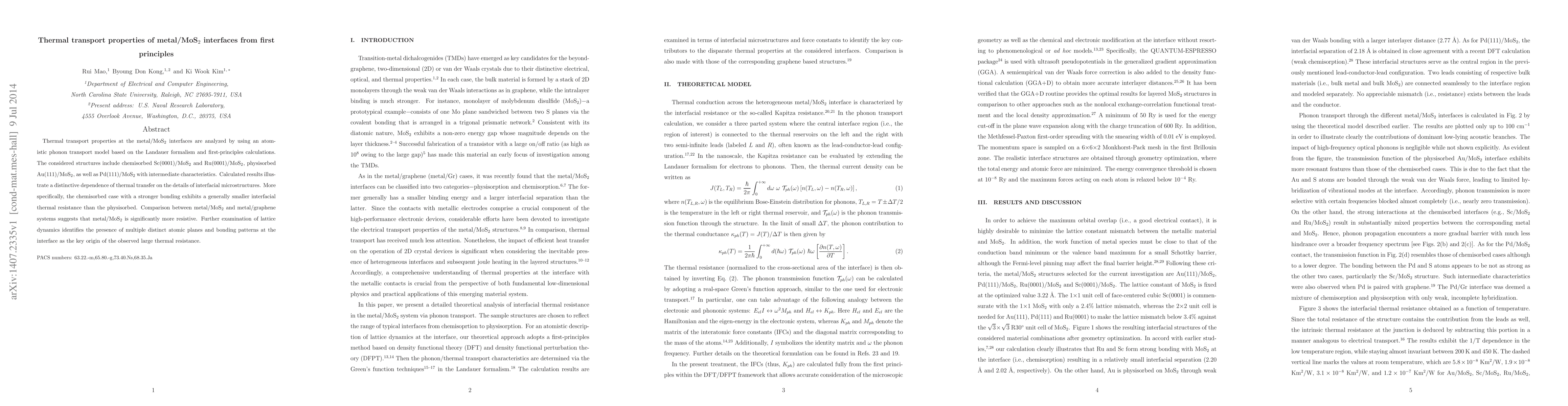 This study investigates thermal transport at metal/MoS2 interfaces using first-principles calculations and an atomistic phonon model. It reveals that chemisorbed metal/MoS2 interfaces with stronger bonding show lower thermal resistance compared to physisorbed ones, and metal/MoS2 interfaces are more resistive than metal/graphene interfaces, primarily due to complex interfacial atomic structures and bonding patterns.