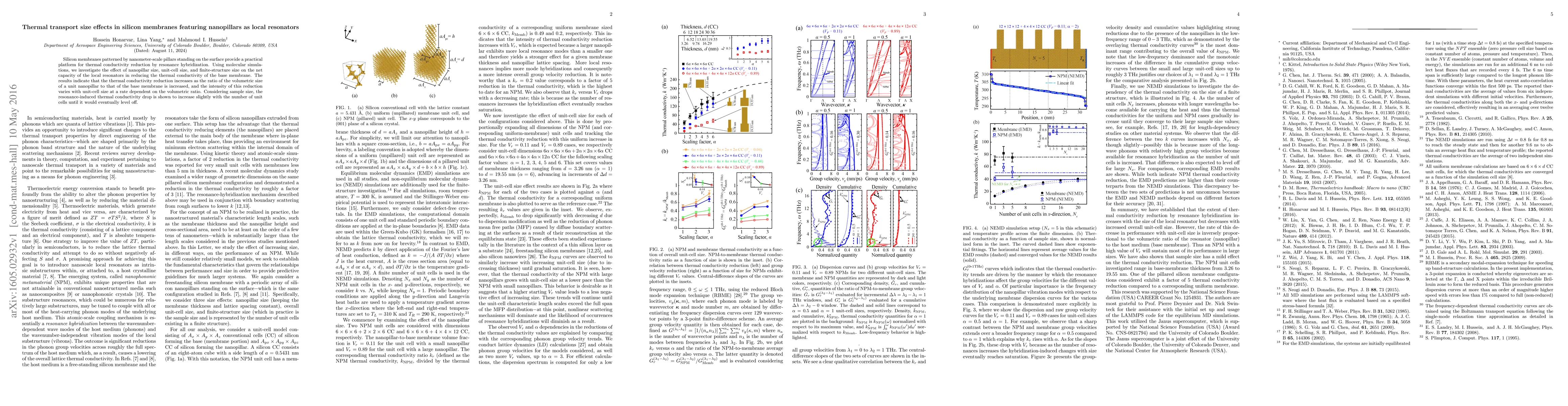 Silicon membranes patterned by nanometer-scale pillars standing on the surface provide a practical platform for thermal conductivity reduction by resonance hybridization. Using molecular simulations, we investigate the effect of nanopillar size, unit-cell size, and finite-structure size on the net capacity of the local resonators in reducing the thermal conductivity of the base membrane. The results indicate that the thermal conductivity reduction increases as the ratio of the volumetric size of a unit nanopillar to that of the base membrane is increased, and the intensity of this reduction varies with unit-cell size at a rate dependent on the volumetric ratio. Considering sample size, the resonance-induced thermal conductivity drop is shown to increase slightly with the number of unit cells until it would eventually level off.