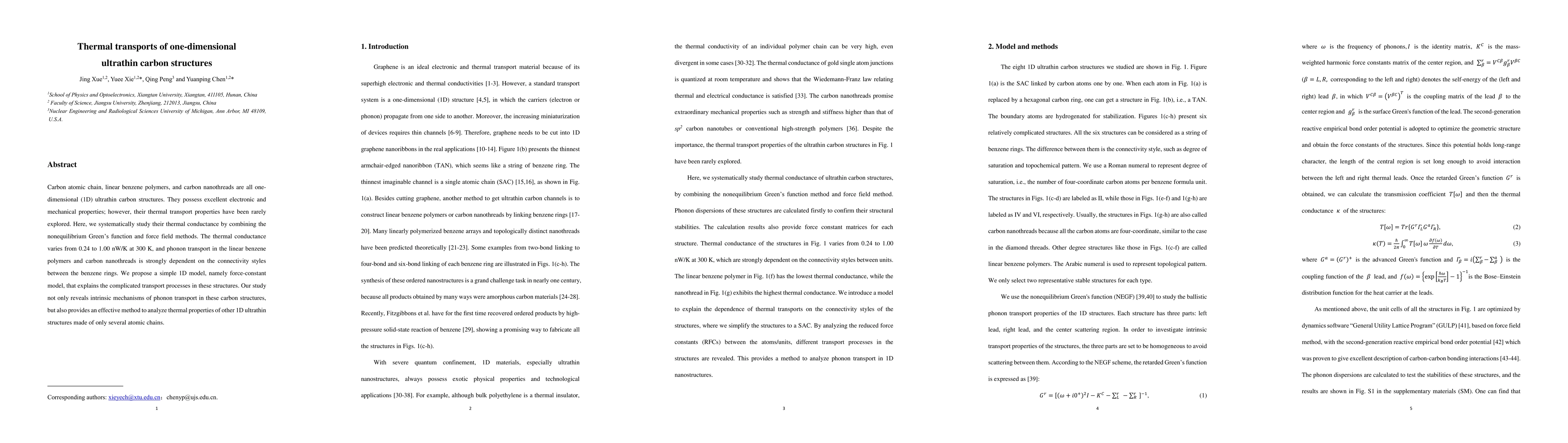 This paper explores the thermal conductance of one-dimensional ultrathin carbon structures like atomic chains, linear benzene polymers, and carbon nanothreads, using nonequilibrium Green's function and force field methods. The study reveals thermal conductance ranging from 0.24 to 1.00 nW/K at 300 K and introduces a force-constant model to explain phonon transport mechanisms.