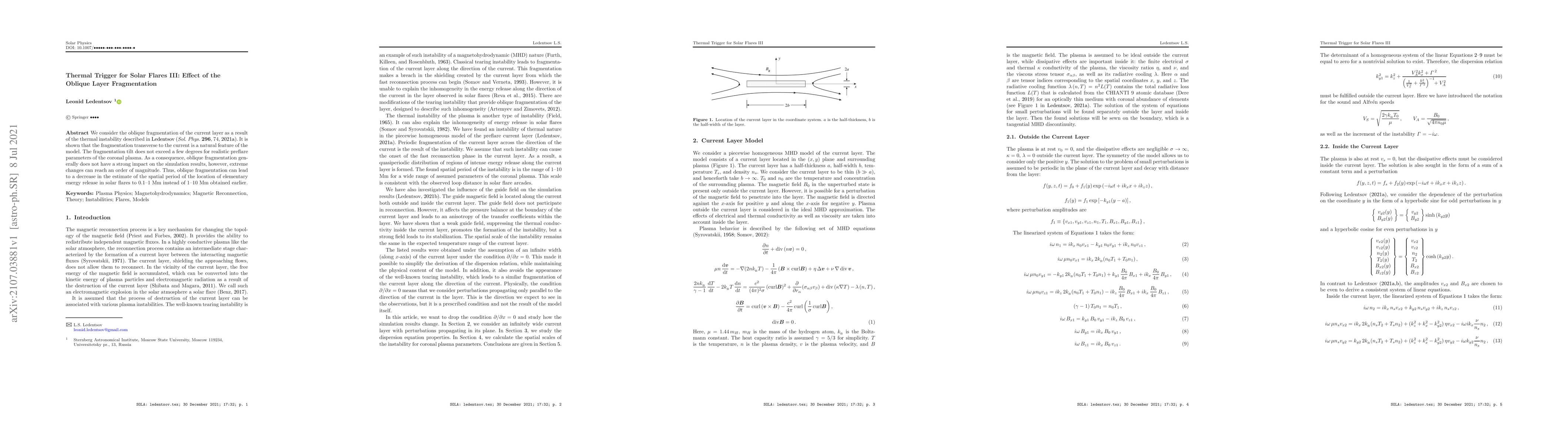We consider the oblique fragmentation of the current layer as a result of the thermal instability described in Ledentsov (Sol. Phys. 296, 74, 2021a). It is shown that the fragmentation transverse to the current is a natural feature of the model. The fragmentation tilt does not exceed a few degrees for realistic preflare parameters of the coronal plasma. As a consequence, oblique fragmentation generally does not have a strong impact on the simulation results, however, extreme changes can reach an order of magnitude. Thus, oblique fragmentation can lead to a decrease in the estimate of the spatial period of the location of elementary energy release in solar flares to 0.1-1 Mm instead of 1-10 Mm obtained earlier.