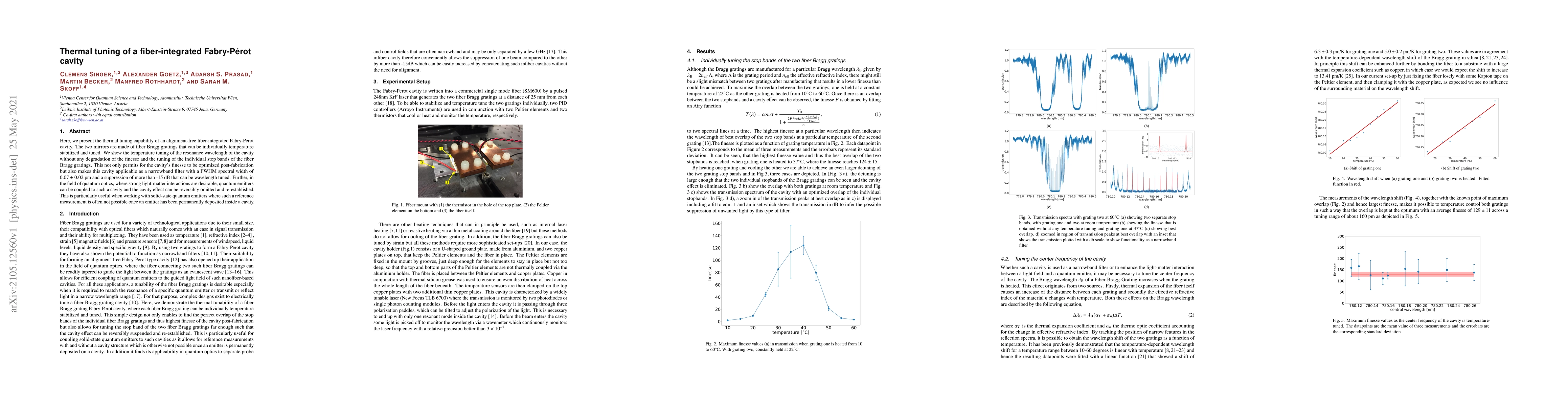 This paper demonstrates a fiber-integrated Fabry-Pérot cavity with thermal tuning capability using fiber Bragg gratings, allowing precise wavelength adjustment without degrading finesse, and enabling its use as a narrowband filter with high suppression and reversible coupling for quantum optics applications.