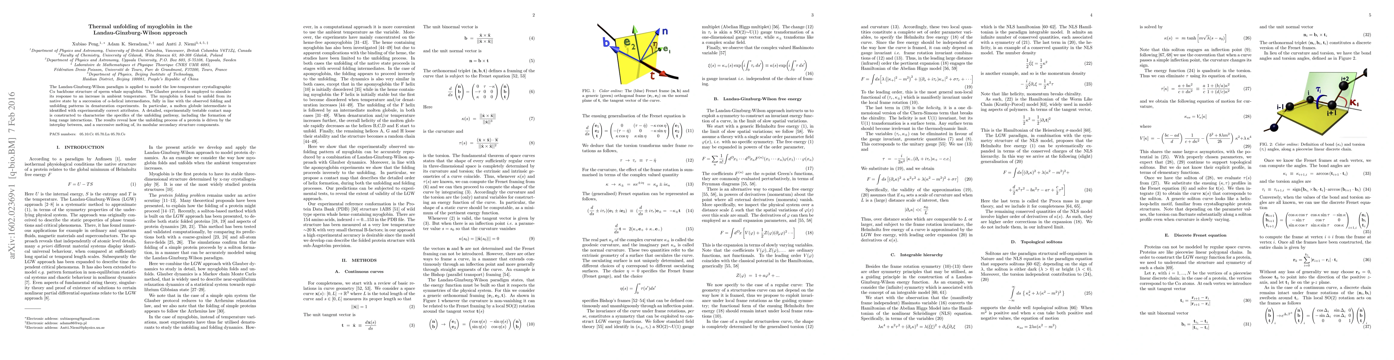 The Landau-Ginzburg-Wilson paradigm is applied to model the low-temperature crystallographic C$\alpha$ backbone structure of sperm whale myoglobin. The Glauber protocol is employed to simulate its response to an increase in ambient temperature. The myoglobin is found to unfold from its native state by a succession of $\alpha$-helical intermediates, fully in line with the observed folding and unfolding patterns in denaturation experiments. In particular, a molten globule intermediate is identified with experimentally correct attributes. A detailed, experimentally testable contact map is constructed to characterise the specifics of the unfolding pathway, including the formation of long range interactions. The results reveal how the unfolding process of a protein is driven by the interplay between, and a successive melting of, its modular secondary structure components.