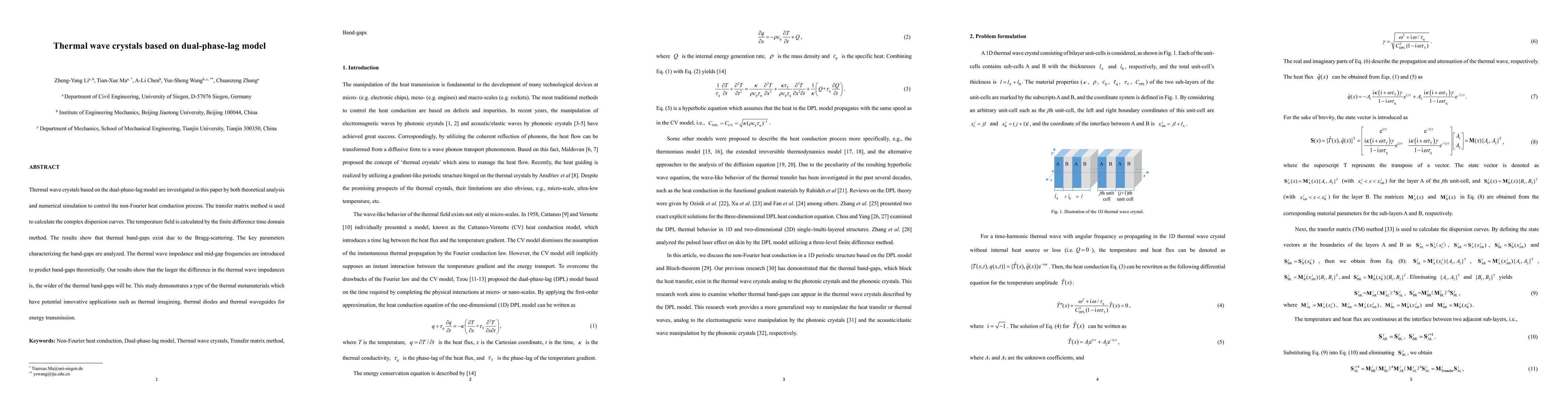 This paper explores thermal wave crystals using a dual-phase-lag model to manage non-Fourier heat conduction, revealing thermal band-gaps through Bragg-scattering and analyzing key parameters like thermal wave impedance. The study suggests potential applications in thermal imaging, diodes, and waveguides.