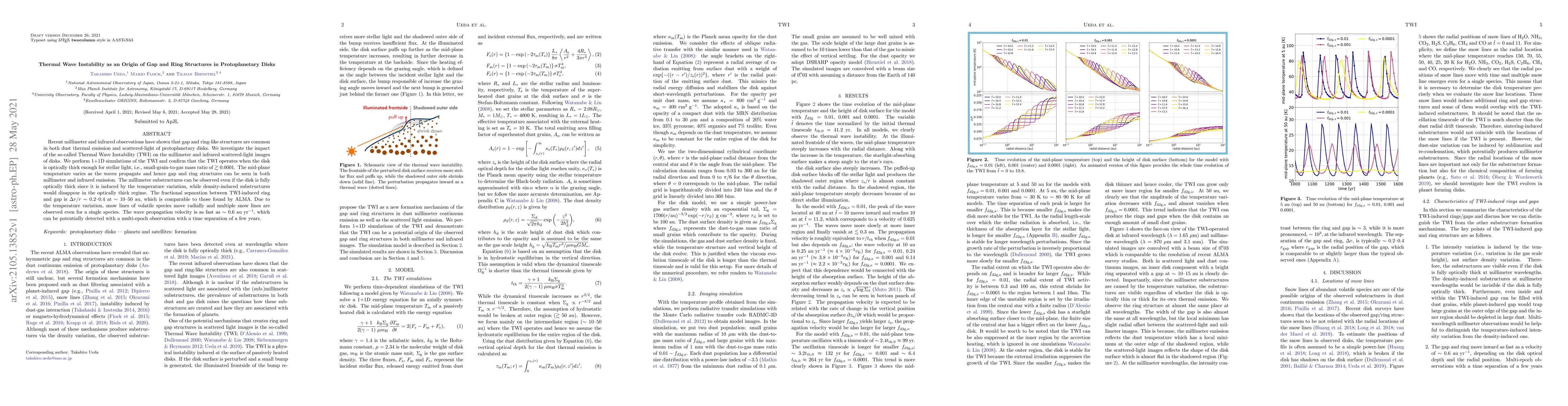 The research explores Thermal Wave Instability (TWI) as a cause for gap and ring structures in protoplanetary disks, confirmed through 1+1D simulations. TWI creates temperature variations leading to observable millimeter and infrared substructures, even in fully optically thick disks, with ring-gap fractions comparable to ALMA observations. Snow lines of volatile species also shift due to TWI, and the wave propagation velocity is fast enough to potentially detect with multi-epoch observations.