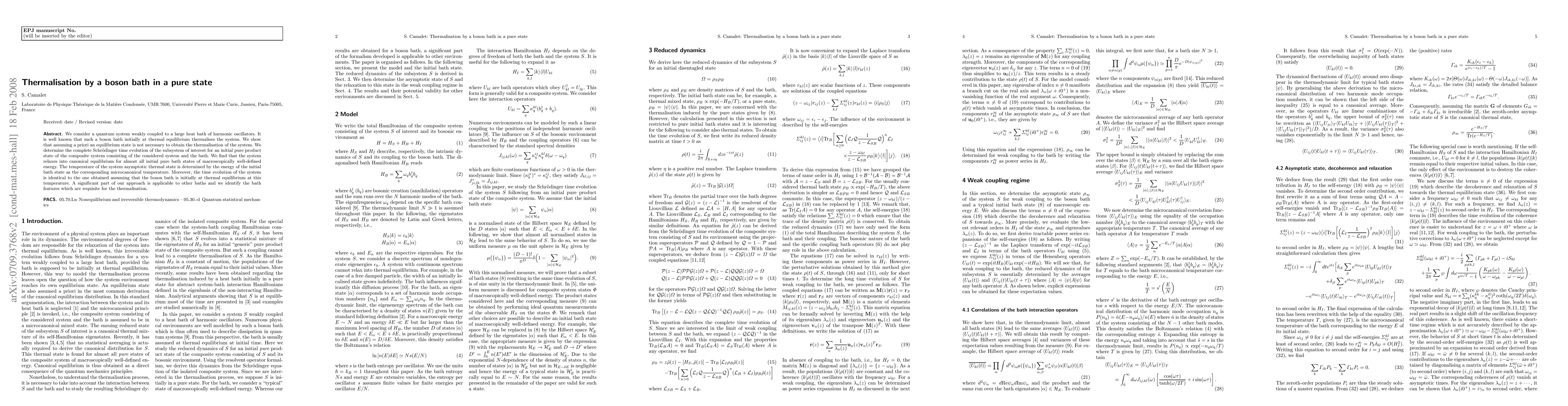 We consider a quantum system weakly coupled to a large heat bath of harmonic oscillators. It is well known that such a boson bath initially at thermal equilibrium thermalises the system. We show that assuming a priori an equilibrium state is not necessary to obtain the thermalisation of the system. We determine the complete Schr\"odinger time evolution of the subsystem of interest for an initial pure product state of the composite system consisting of the considered system and the bath. We find that the system relaxes into canonical equilibrium for almost all initial pure bath states of macroscopically well-defined energy. The temperature of the system asymptotic thermal state is determined by the energy of the initial bath state as the corresponding microcanonical temperature. Moreover, the time evolution of the system is identical to the one obtained assuming that the boson bath is initially at thermal equilibrium with this temperature. A significant part of our approach is applicable to other baths and we identify the bath features which are requisite for the thermalisation studied.