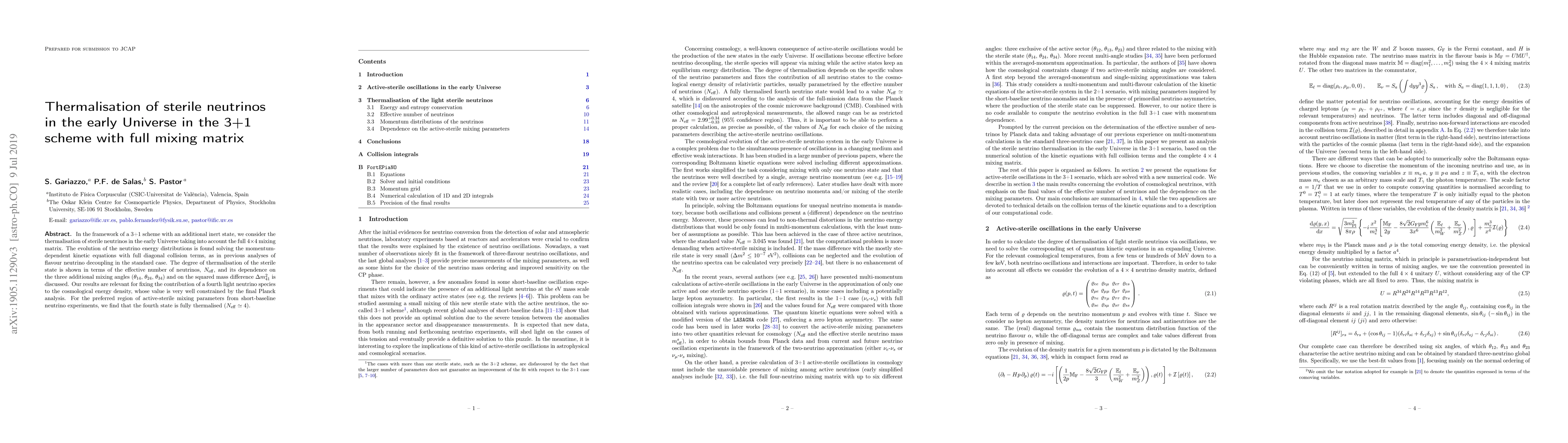 This paper investigates the thermalisation of sterile neutrinos in the early Universe within a 3+1 scheme, considering a full 4x4 mixing matrix. It finds that the fourth neutrino state is fully thermalised, contributing an effective number of neutrinos $N_{\rm eff}$ of approximately 4, which is significant for cosmological energy density constraints.