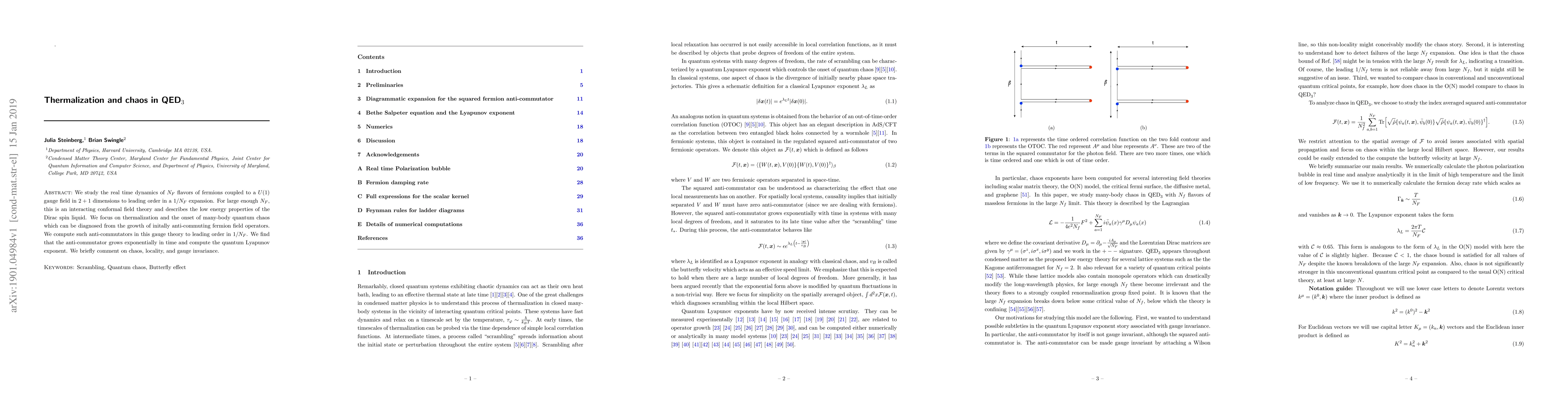 This paper investigates the real-time dynamics of fermions in a $2+1$ dimensional $U(1)$ gauge theory, focusing on thermalization and quantum chaos in the context of a Dirac spin liquid. The study finds that anti-commuting fermion field operators grow exponentially, revealing an emergent quantum Lyapunov exponent indicative of chaos.
