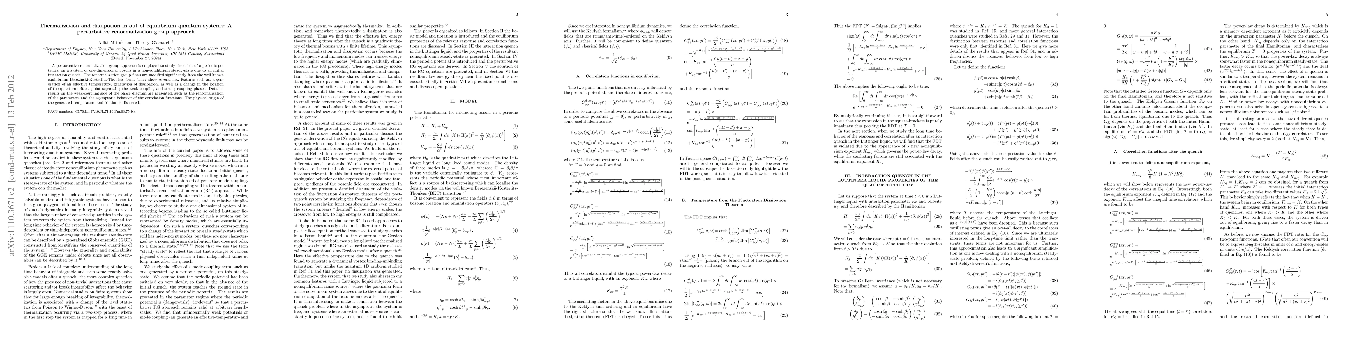 This paper uses a perturbative renormalization group approach to investigate the thermalization and dissipation in a one-dimensional bosonic system subjected to an interaction quench, leading to a non-equilibrium steady state. The study reveals new features such as effective temperature generation, dissipation, and shifts in the quantum critical point, alongside detailed analysis of weak-coupling phase renormalization and correlation functions.