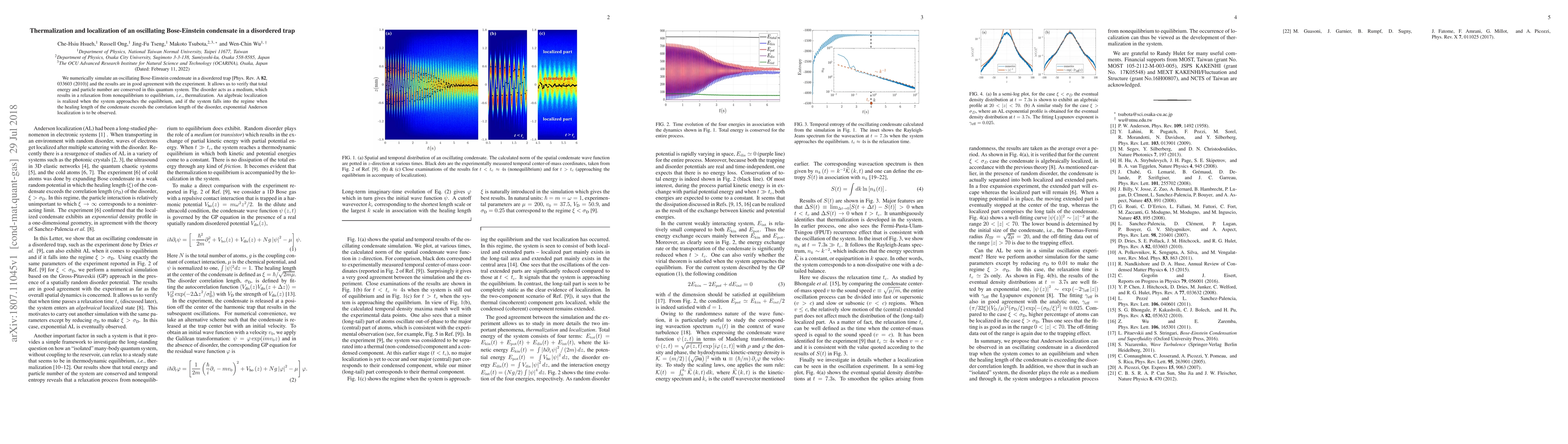 This paper numerically simulates an oscillating Bose-Einstein condensate in a disordered trap, verifying energy and particle number conservation. The disorder facilitates thermalization and leads to algebraic localization, with exponential Anderson localization occurring when the healing length exceeds the disorder's correlation length.