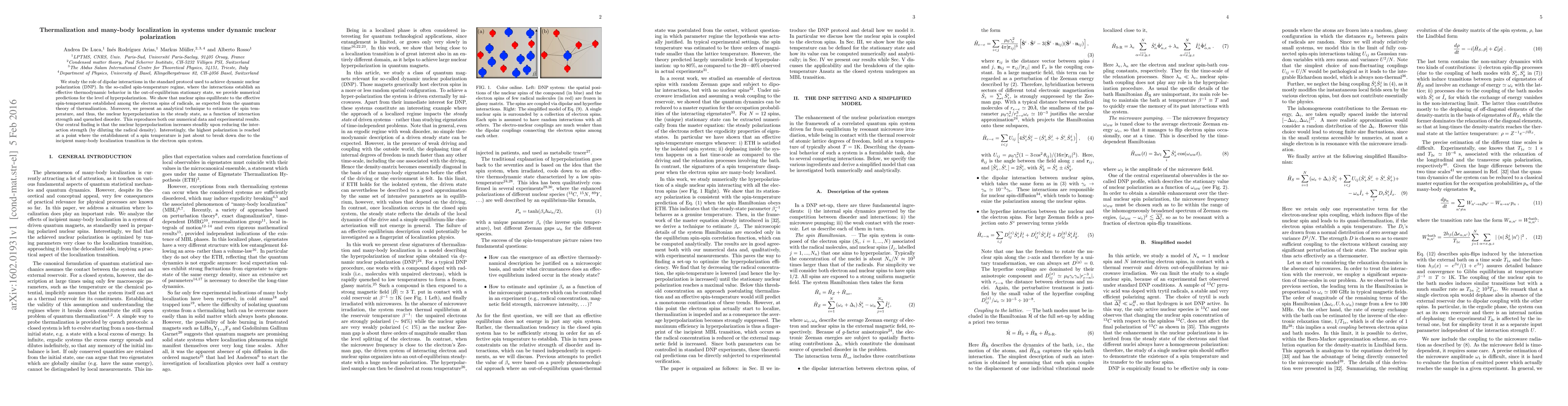 This paper investigates the thermalization and many-body localization in systems undergoing dynamic nuclear polarization (DNP), focusing on dipolar interactions. It finds that nuclear spins equilibrate to an effective spin-temperature set by electron spins, and presents an analytical method to estimate nuclear hyperpolarization, which increases with reduced interaction strength until a many-body localization transition occurs.